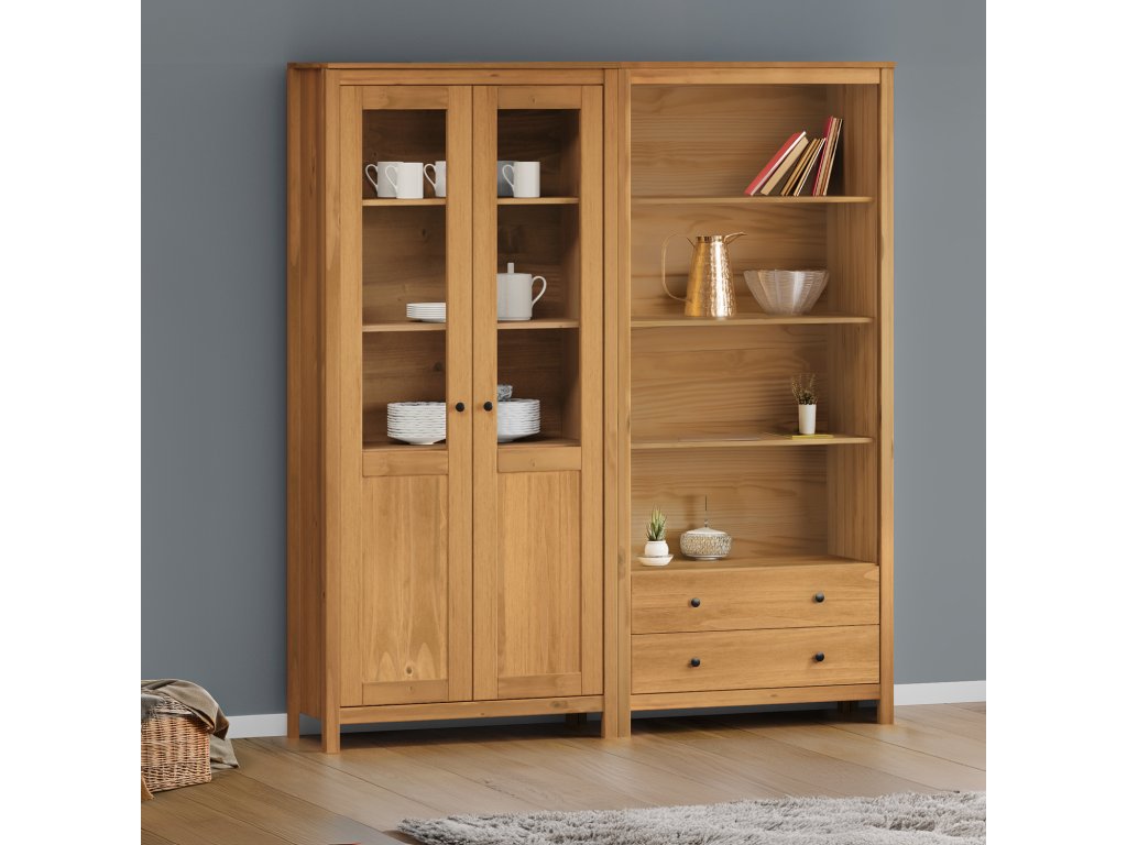 Vyrobena z voskované borovice v medovém odstínu, knihovna zaručuje pevnost a dlouhou životnost. Přírodní voskování zvýrazňuje strukturu dřeva a usnadňuje údržbu.