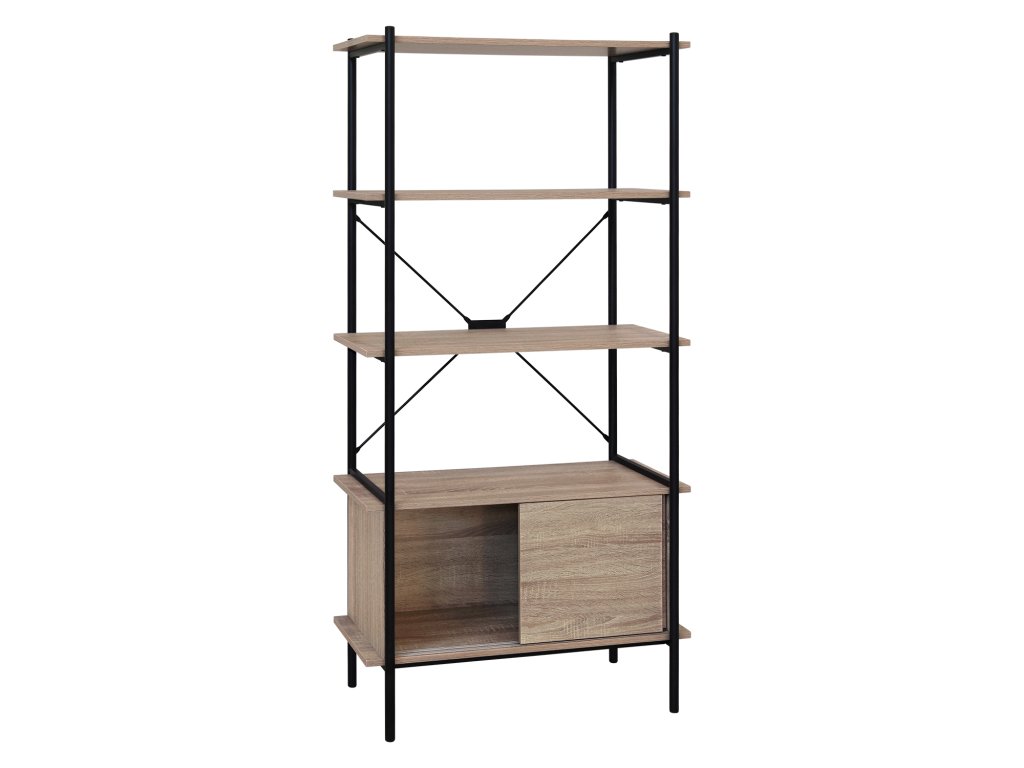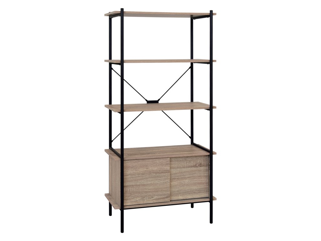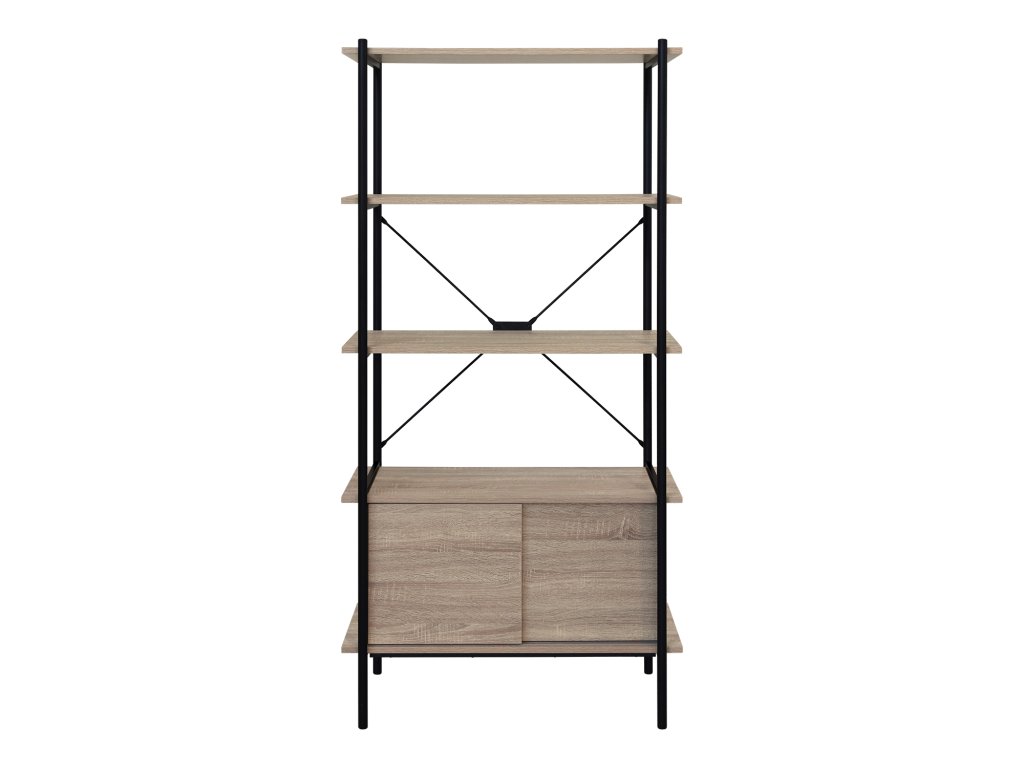Knihovna má pevnou kovovou konstrukci v černé barvě a police jsou v dekoru dub Sonoma, což zaručuje stabilitu a moderní vzhled.