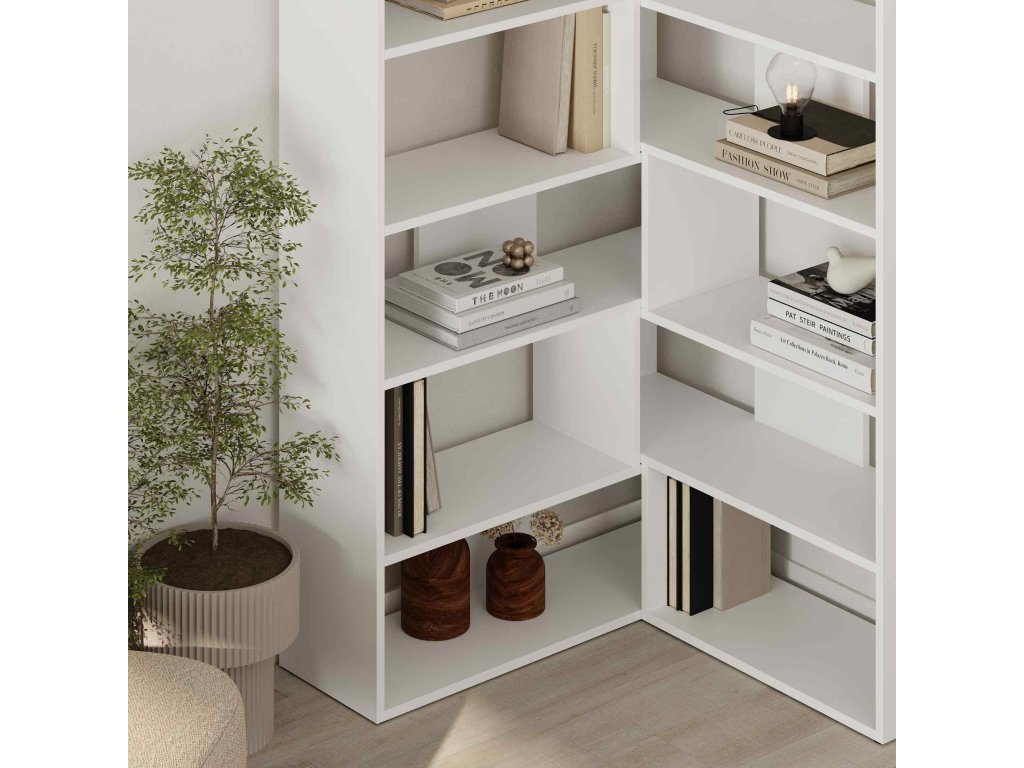 MYRTIS 4 je rohový regál v bílém provedení, ideální pro obývací pokoj. Nabízí dostatek úložného prostoru s 4-5 policemi, vhodný pro knihy, dekorace či elektroniku.