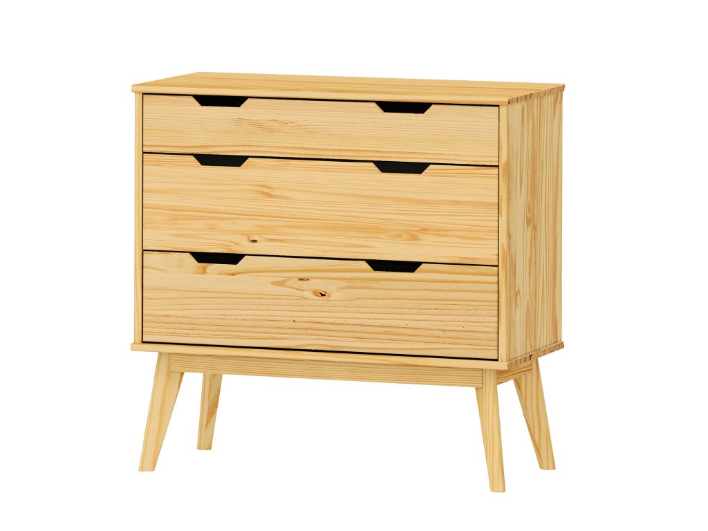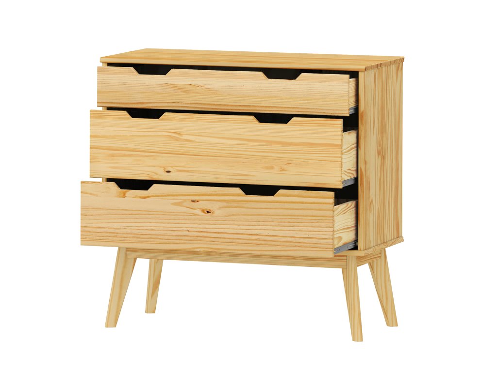 Komoda je vyrobena z masivní borovice s lakovaným povrchem, který zvyšuje odolnost a usnadňuje údržbu.