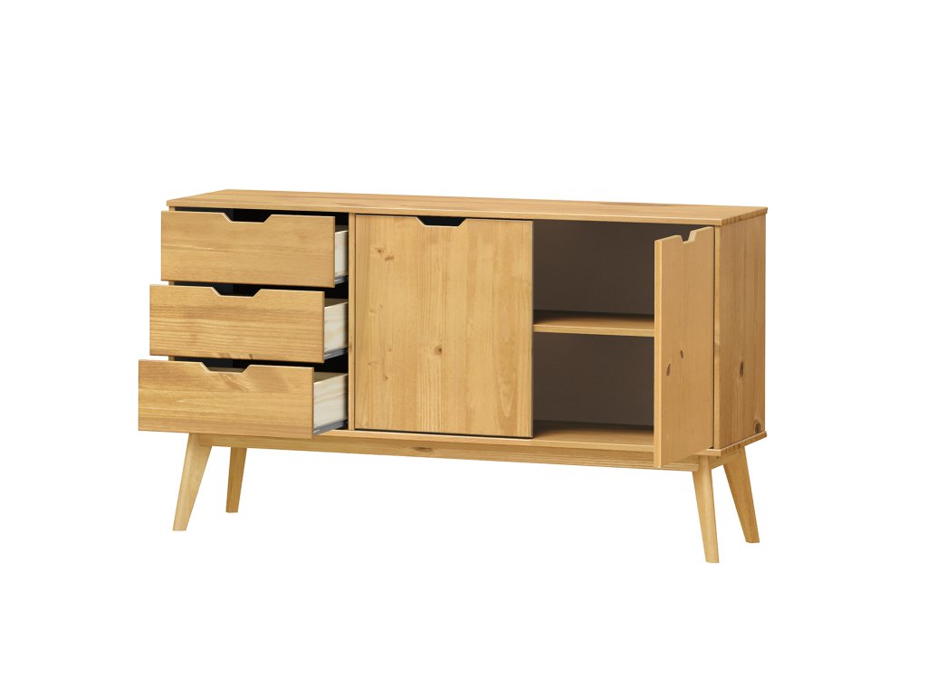 Komoda je vyrobena z masivní borovice s voskovaným povrchem, který zvýrazňuje přírodní vzhled a zajišťuje odolnost.