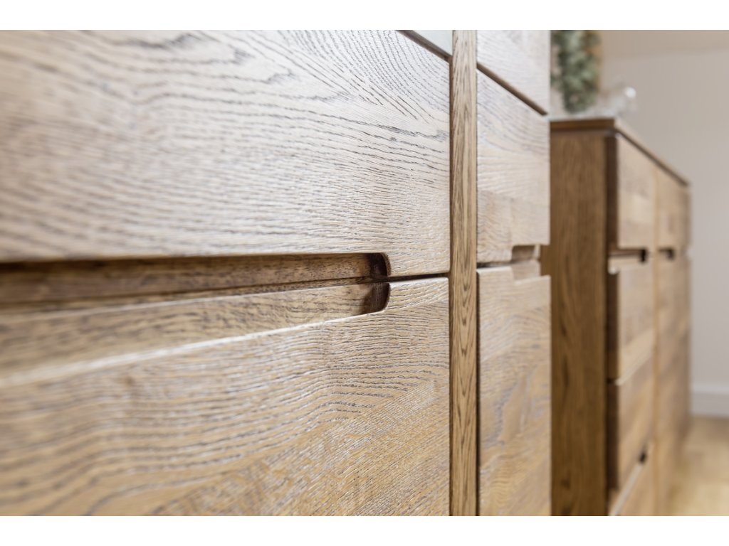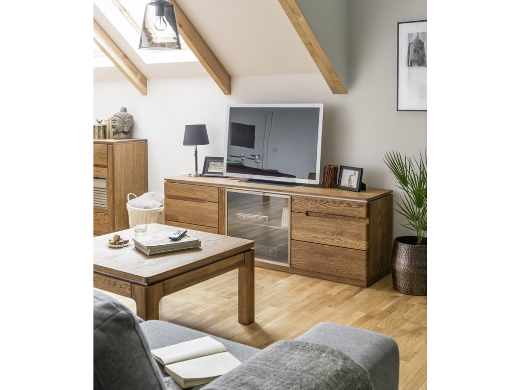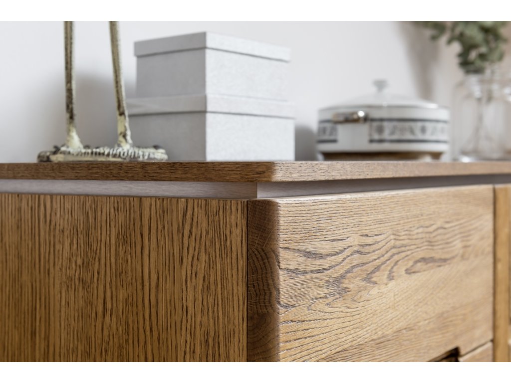 Komoda třídveřová prosklená. Jednoduché linie a kvalitní zpracování ve spojení s nadčasovým designem této řady dodají vaší jídelně nebo obývacímu pokoji jedinečný vzhled. Povrch vnějších částí je ošetřen olejem. Korpus je z vnější strany doplněn přírodní dubovou dýhou, vnitřní strana je z desky LTD v barvě přírodního dřeva. Dvířka jsou vyrobeny z masivního dubu rustikal, sklo je tvrzené v ocelovém rámu. Úchyty jsou vyfrézované do přední desky, ve střední části je úchyt kovový integrovaný v rámu skla. Možno dokoupit LED osvětlení. Dodáváme již ve smontovaném stavu.Buďte první, kdo napíše příspěvek k této položce.