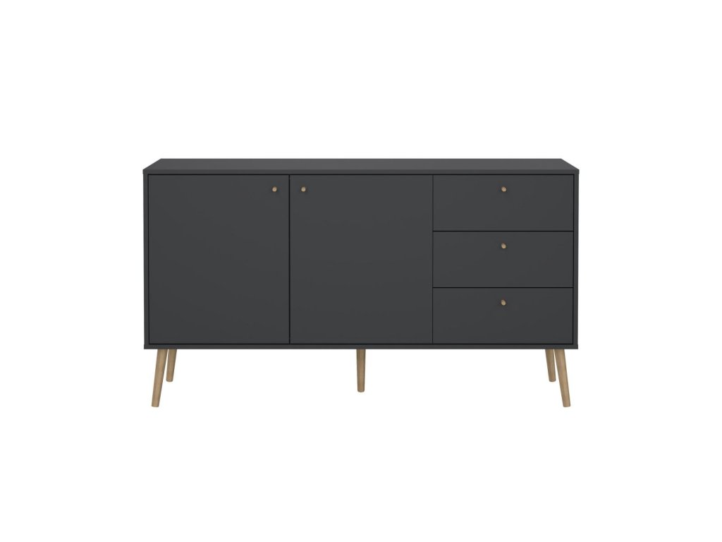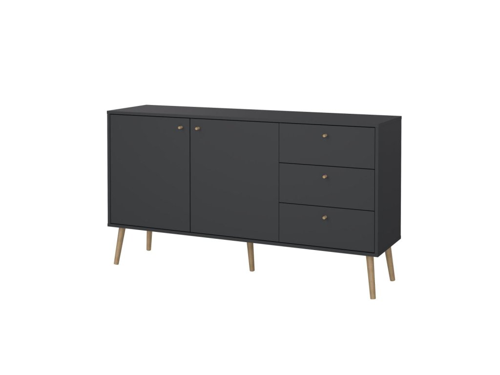 Design komody kombinuje šedou barvu s přírodním dubovým dřevem, což dodává interiéru moderní a nadčasový vzhled.
