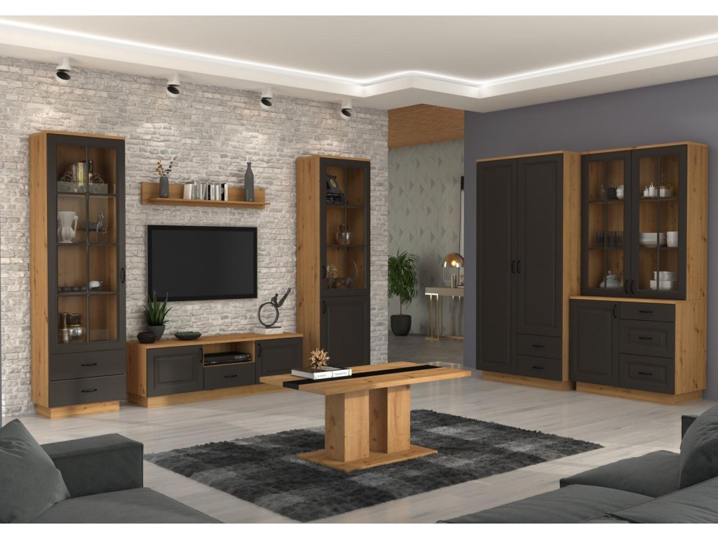 Rustikální kolekce Flower s frézovanými MDF čely a kovovými černými úchyty dodává interiéru teplo a styl, vhodná do obývacích pokojů či jídelny.