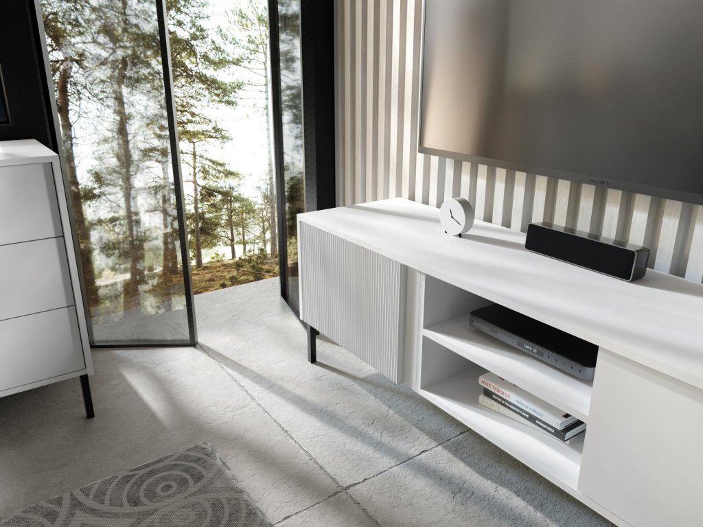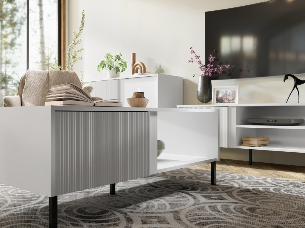 Design kombinuje bílé lamely s čistými liniemi, což vytváří elegantní a nadčasový vzhled. Komoda se snadno sladí s dalšími kusy nábytku.