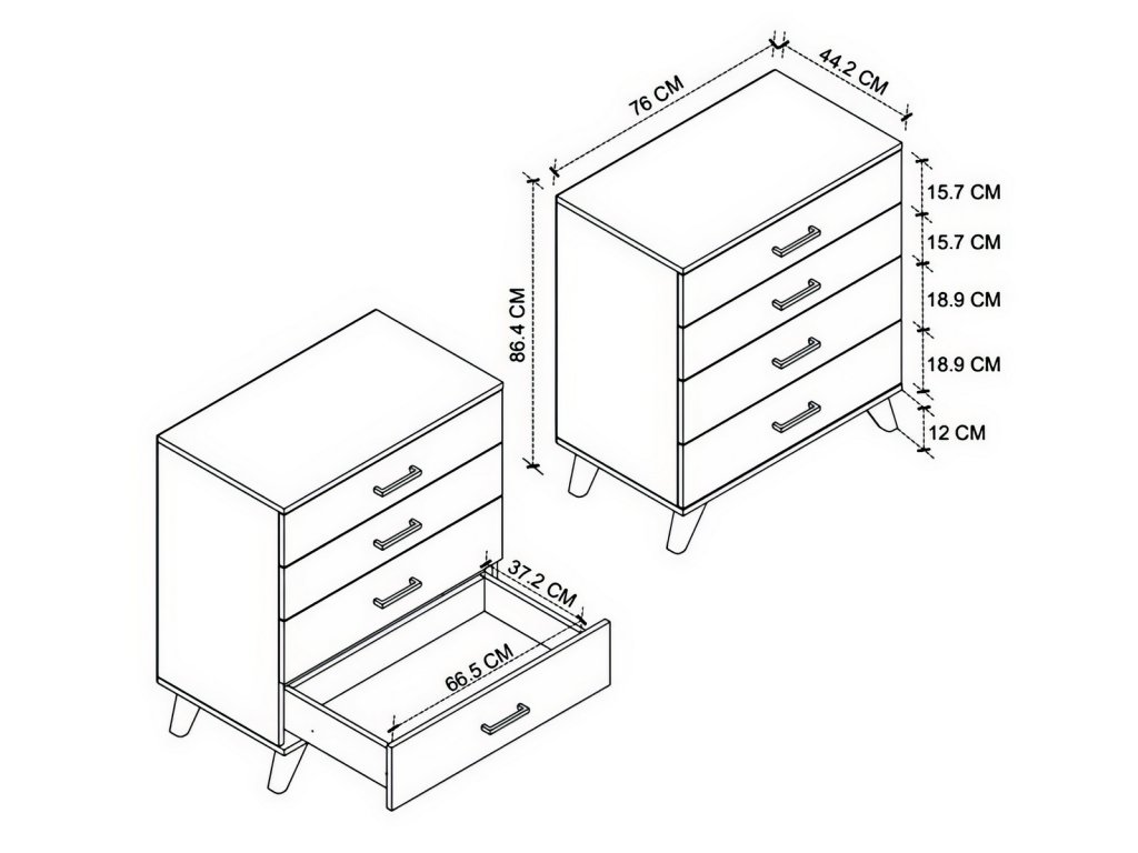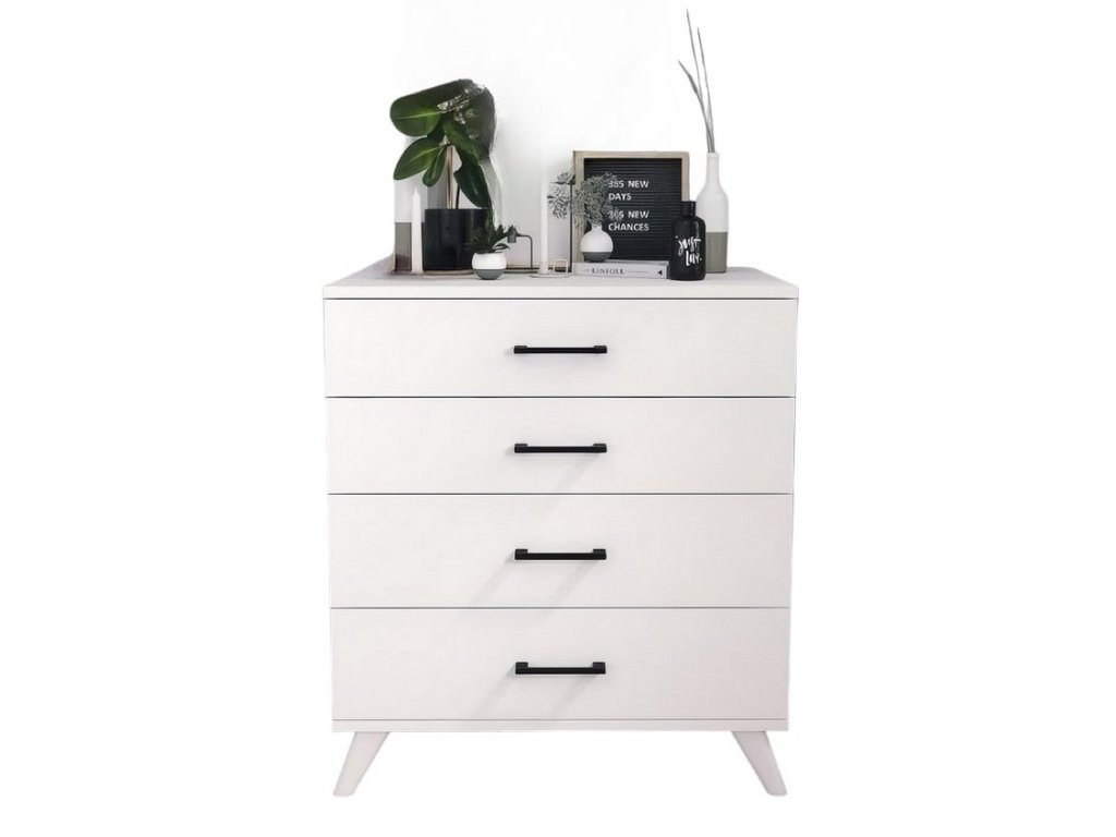 Komoda se čtyřmi zásuvkami je vyrobena z kvalitní desky LTD tl. 18 mm v barevném provedení bílá. Komoda je na nožkách vysokých 12 cm. Dodáváme v demontovaném stavu.