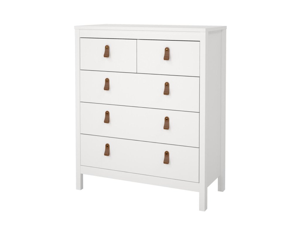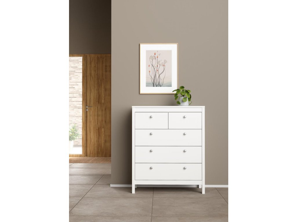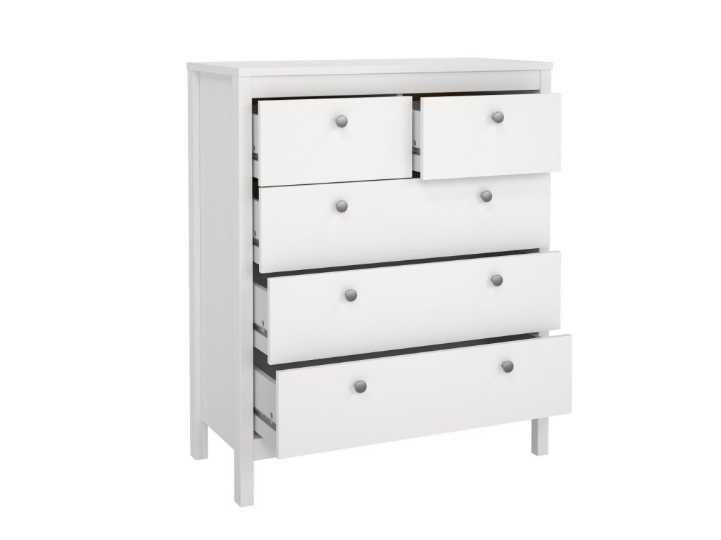 Komoda Real 5s bílá nabízí pět prostorných zásuvek pro uspořádání oblečení, dokumentů nebo domácích drobností. Díky kompaktním rozměrům se hodí do ložnice, obývacího pokoje i předsíně.