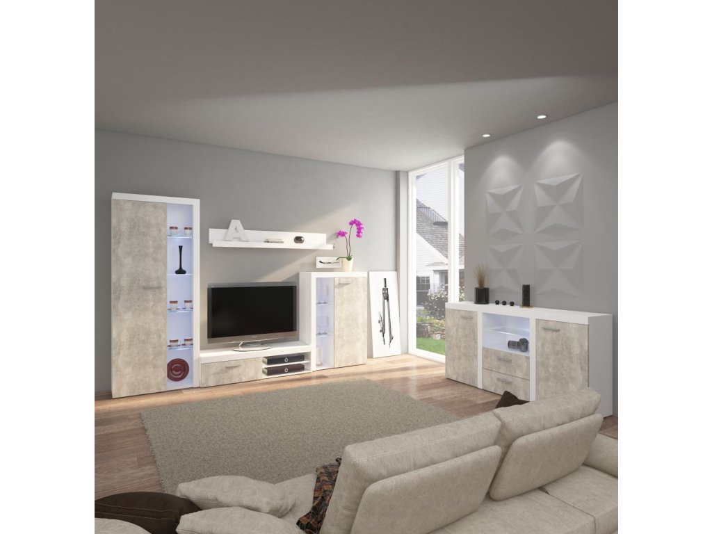 Elegantní kombinace bílé barvy a betonového dekoru se hodí do různých interiérů, od obývacího pokoje po ložnici či kancelář.