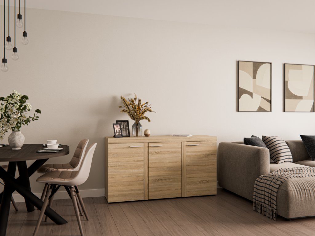 Komoda Rizo od značky FALCO nabízí dostatek prostoru pro uložení oblečení, dokumentů nebo domácích potřeb. Díky třem dveřím snadno uspořádáte věci v obývacím pokoji, ložnici či pracovně.