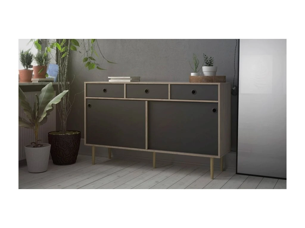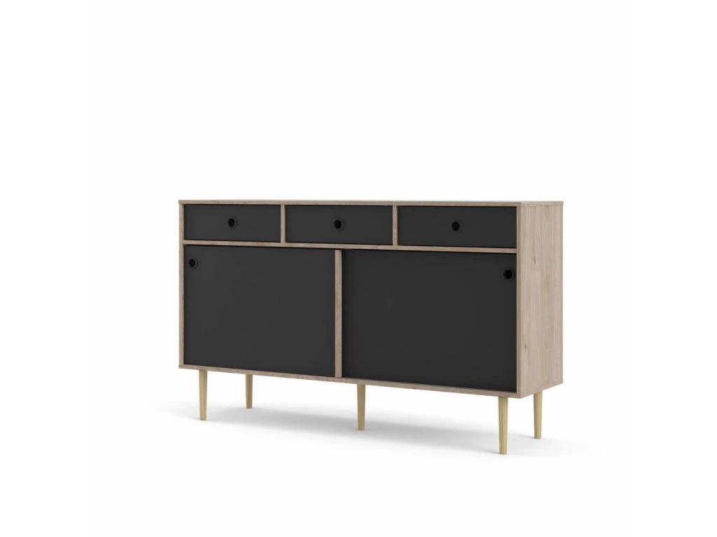 Design komody zdůrazňují vysoké nožky, kulaté výřezy místo úchytek a posuvná dvířka, která usnadňují přístup a šetří místo. Stylové provedení v barvě hickory s černými detaily doplní interiér s retro nebo industriálním nádechem.