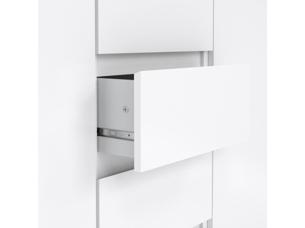 Komoda je vyrobena z kvalitního lamina s povrchovou úpravou v bílém lesku, která je odolná a snadno se čistí.