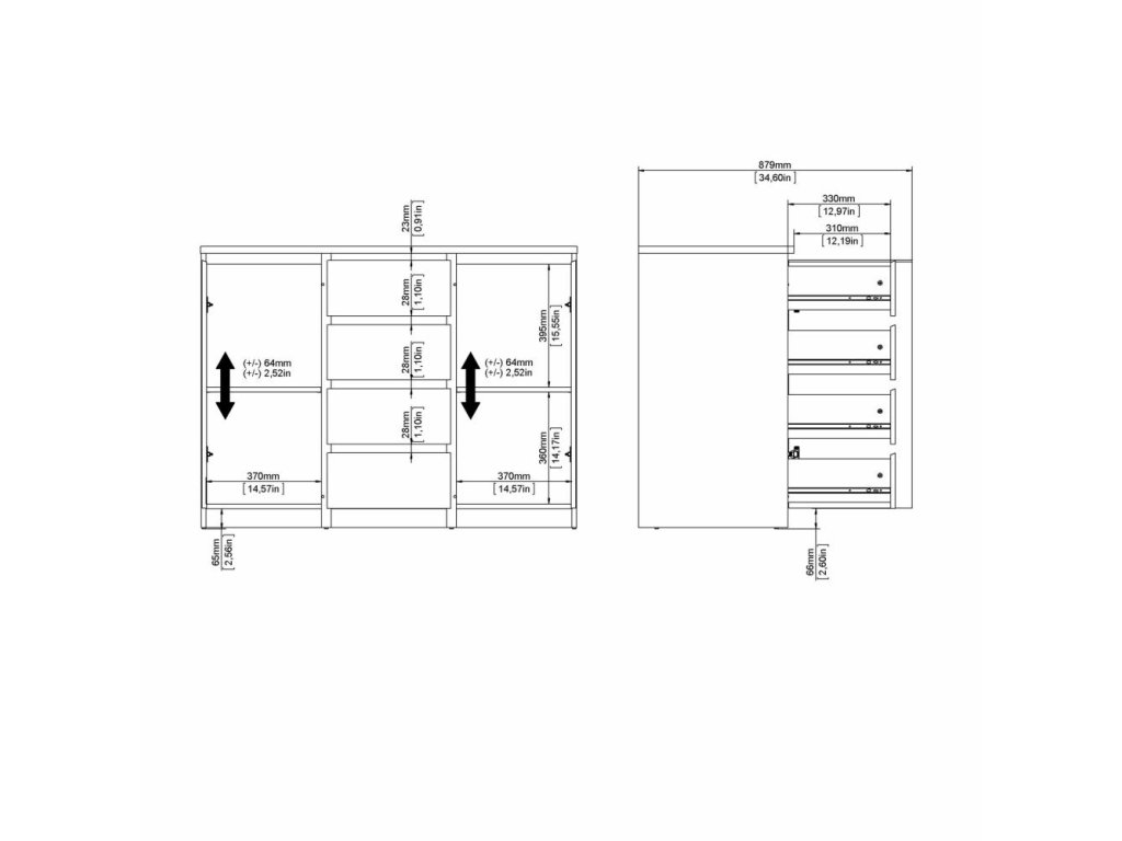 Komoda má výšku 91 cm, šířku 121 cm a hloubku 50 cm, což ji předurčuje k využití v různých prostorách bytu.