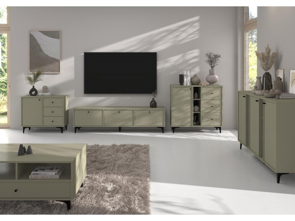 Série Tomila nabízí noční, TV i konferenční stolky, vitríny a komody v široké škále tvarů, barev a typů noh.