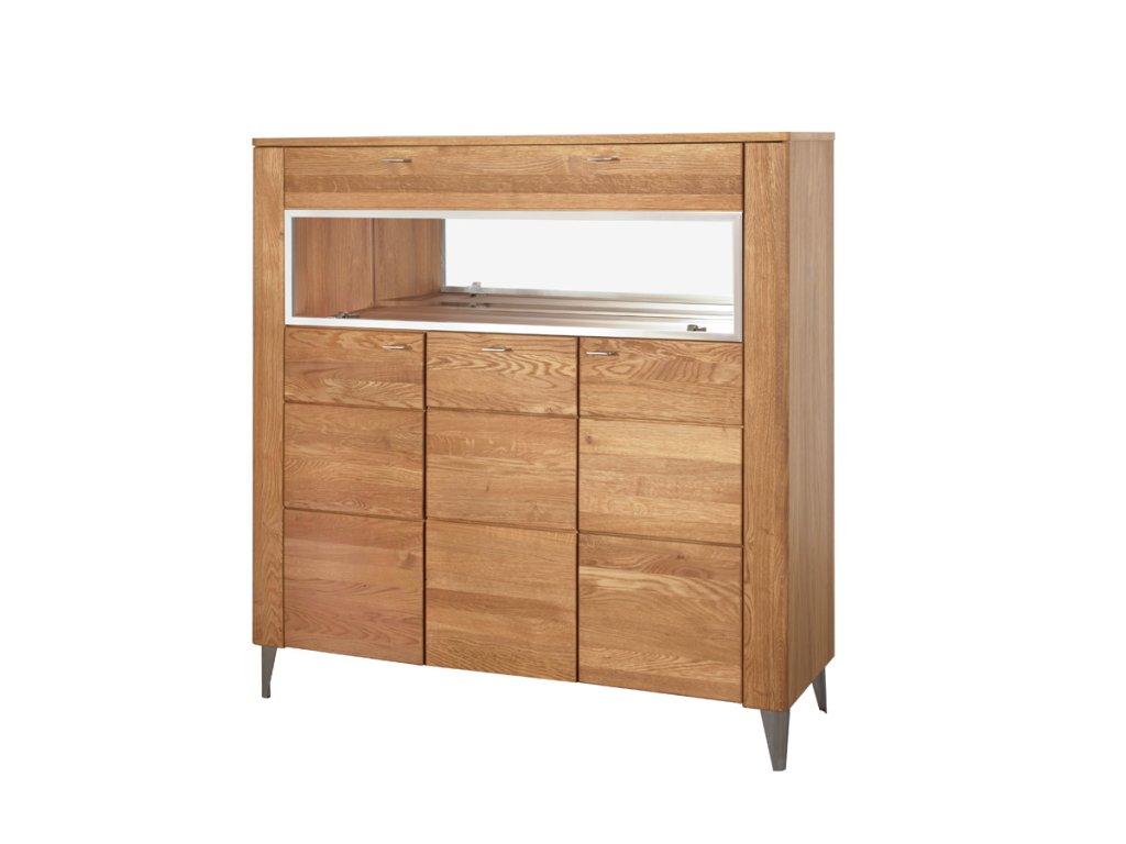Komoda je třídveřová. V každé části se nacházejí dvě police. Ve vrchní části jsou výklopná prosklená dvířka. Uvnitř je úložný prostor s designovým zrcadlem. LED osvětlení není v ceně. Lze si jej dokoupit.