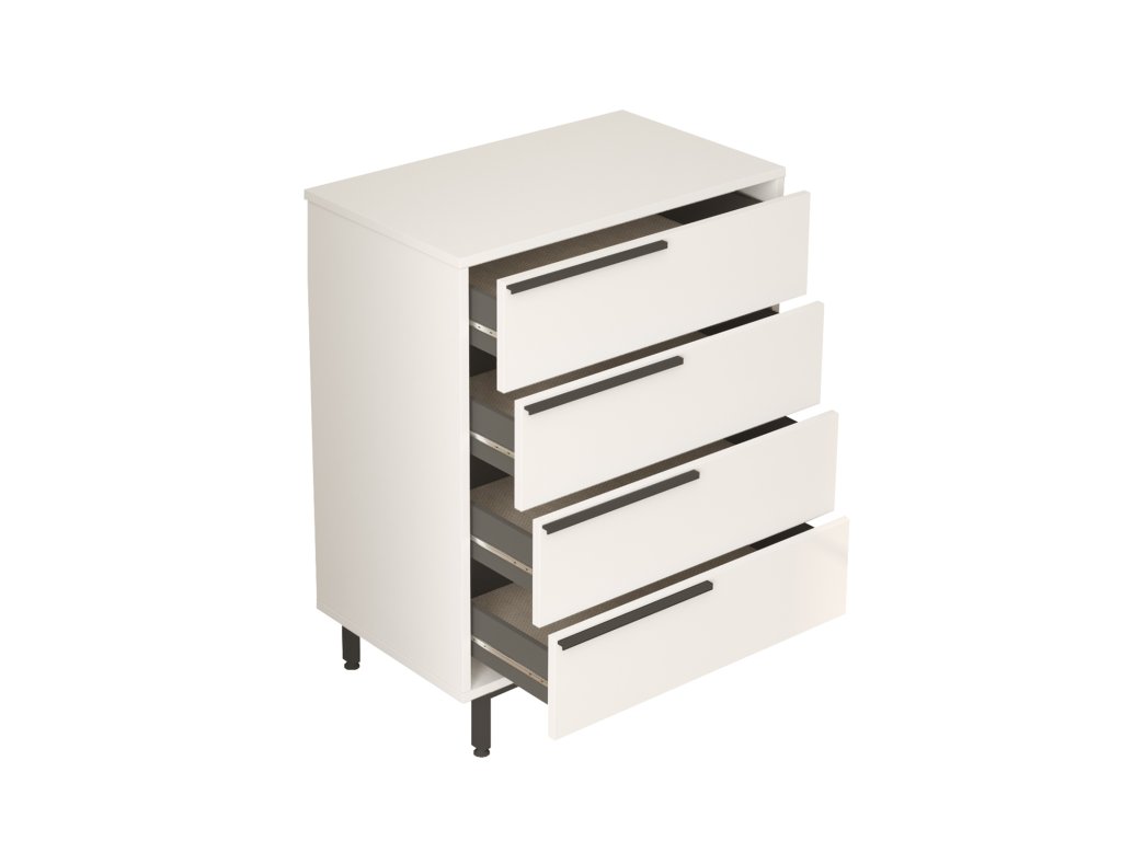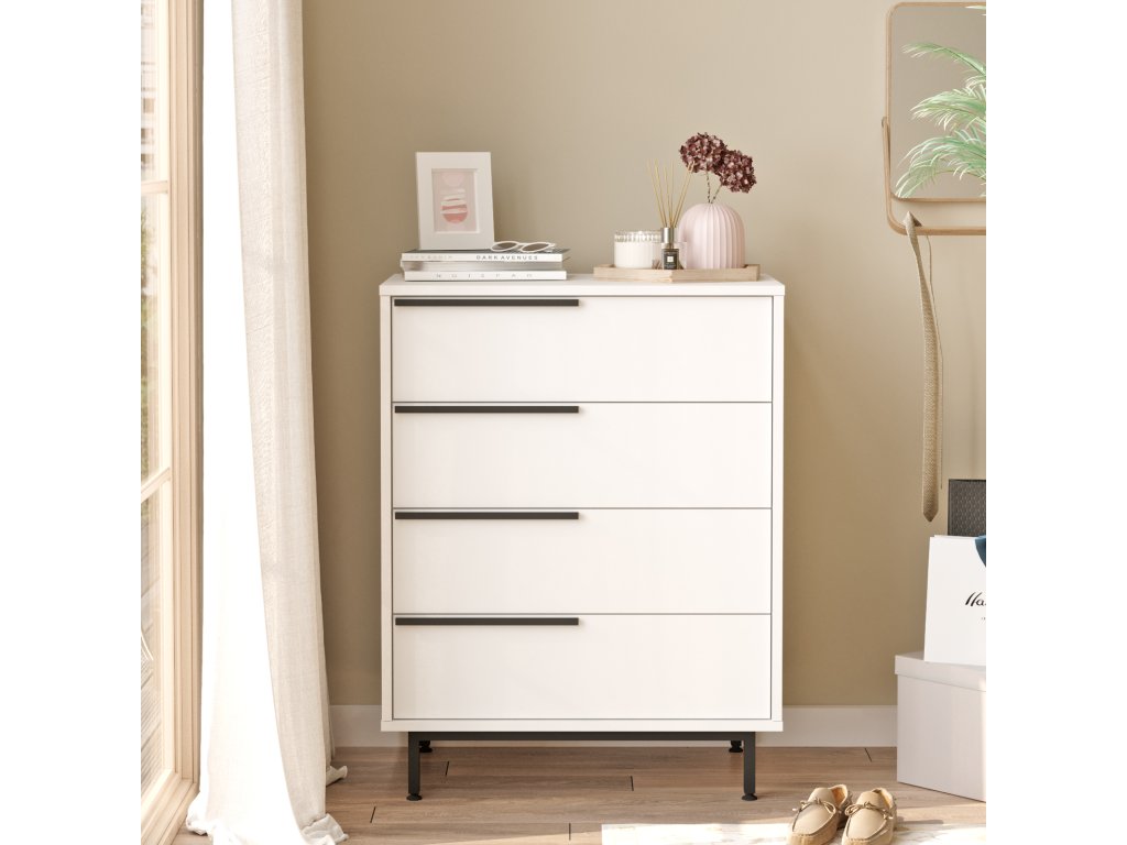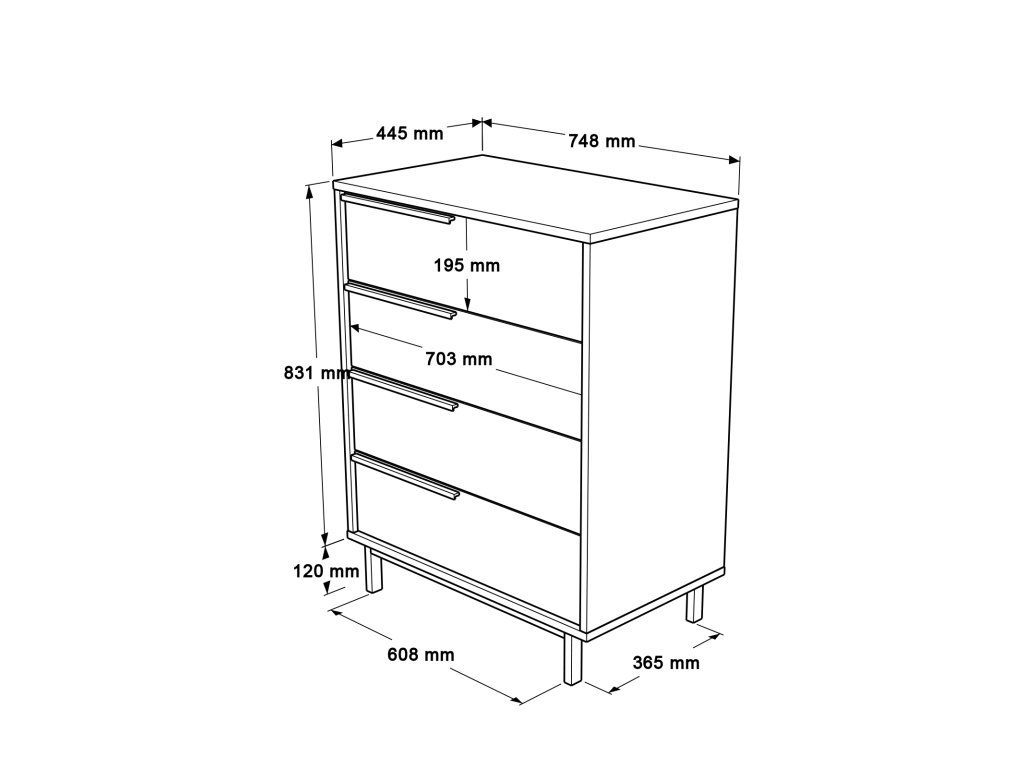 kombinuje praktičnost a moderní estetiku. Čtyři prostorné zásuvky poskytují úložný prostor pro oblečení, dokumenty, dekorace nebo další nezbytnosti. Díky svým kompaktním rozměrům a nožičkám se snadno hodí do různých interiérů, přičemž dodává místnosti elegantní a sofistikovaný vzhled.