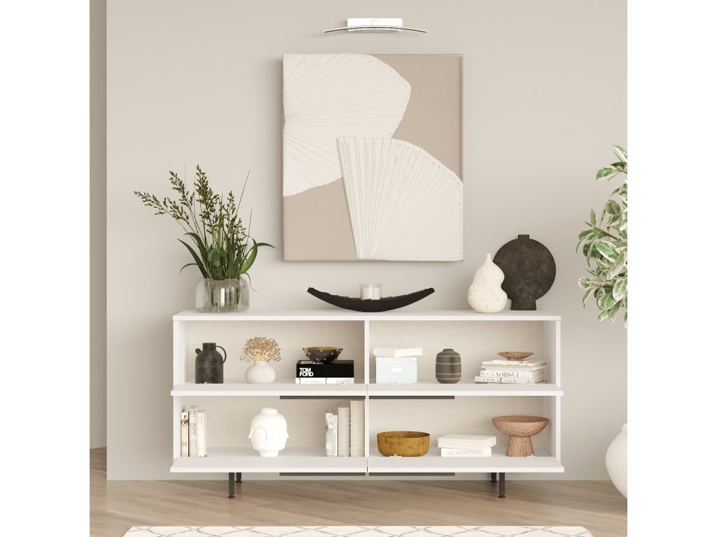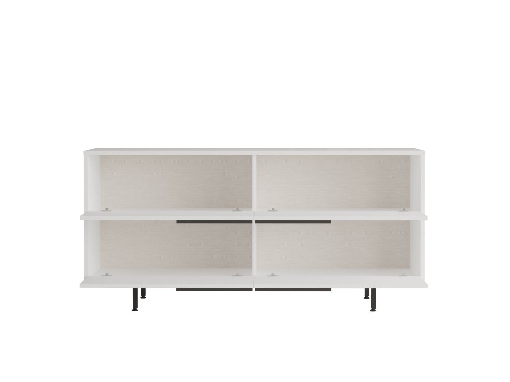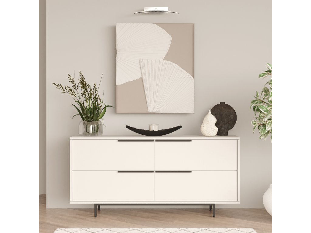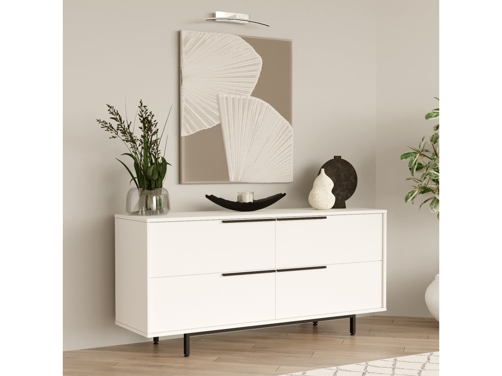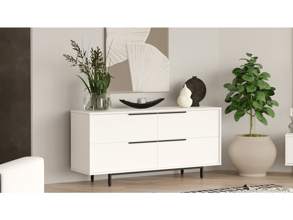 kombinuje moderní design a vysokou funkčnost. Čtyři plná dvířka poskytují praktický úložný prostor, který pomáhá udržet váš obývací pokoj čistý a organizovaný. Díky svému elegantnímu provedení a univerzálnímu stylu se komoda snadno začlení do jakéhokoli interiéru.