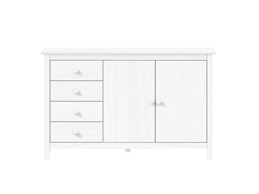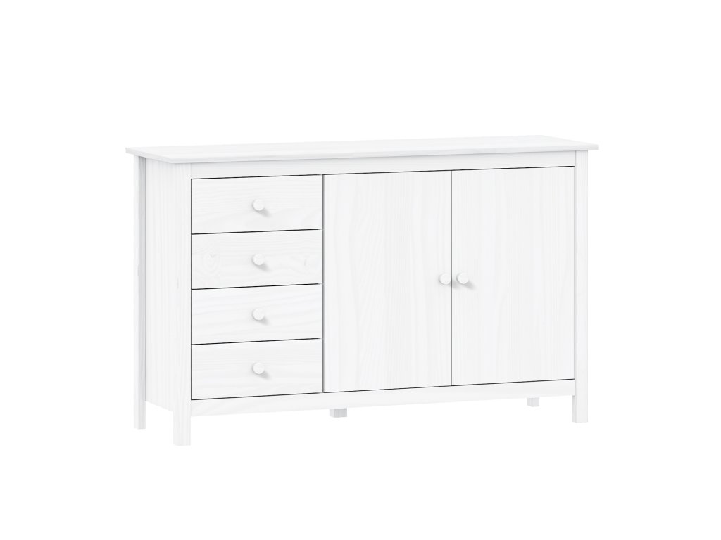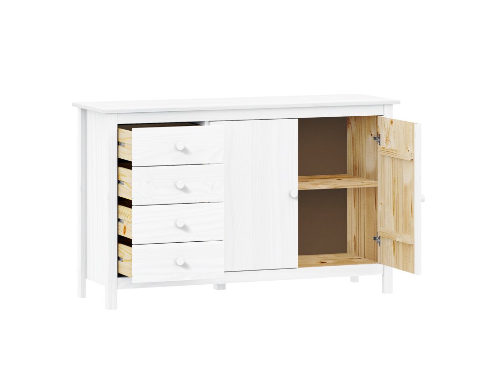 Komoda je vyrobena z masivu borovice s bílým lakem, což zaručuje pevnost a přírodní vzhled.