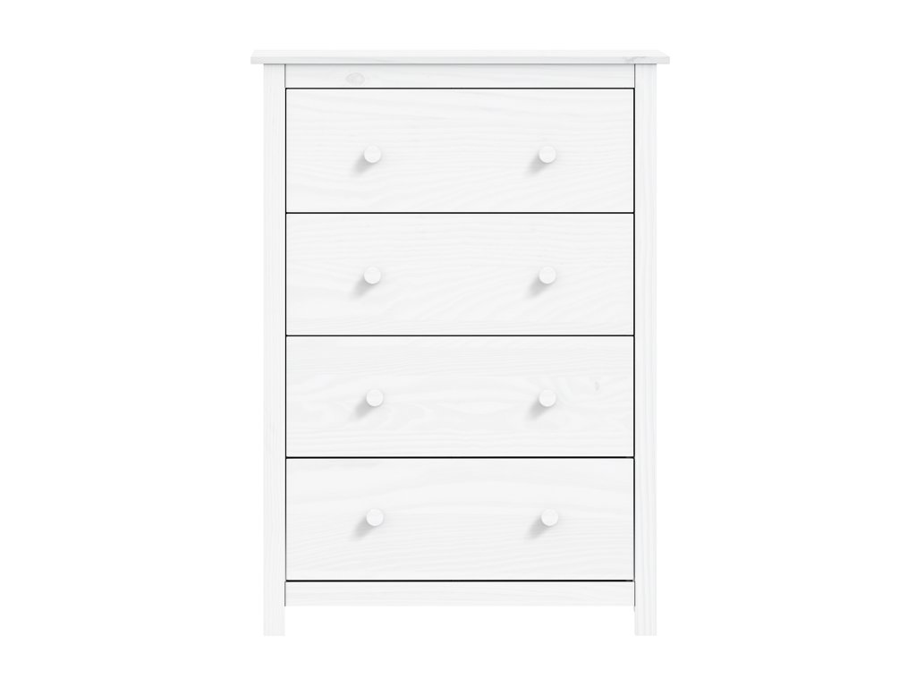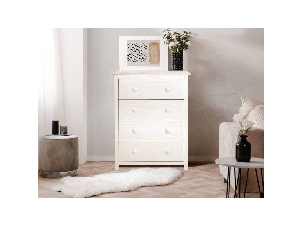 Vyrobena z kvalitního masivu borovice s bílým lakem, komoda zajišťuje dlouhou životnost a přírodní vzhled vhodný do různých interiérů.
