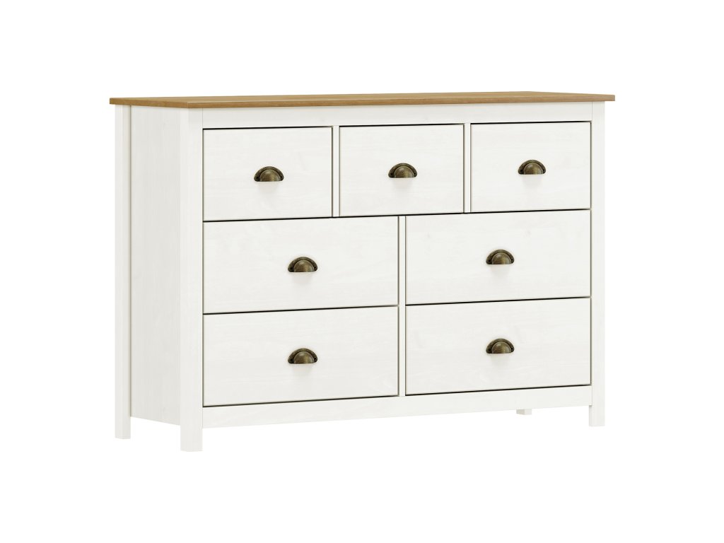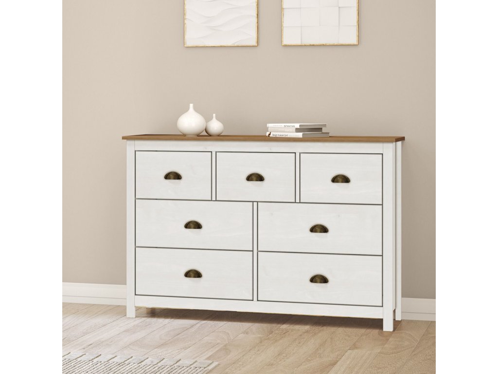 materiál masiv borovice, barevné provedení bílý / hnědý lak sedm zásuvek s kovovými úchytkami a pojezdyDoplňkové parametry