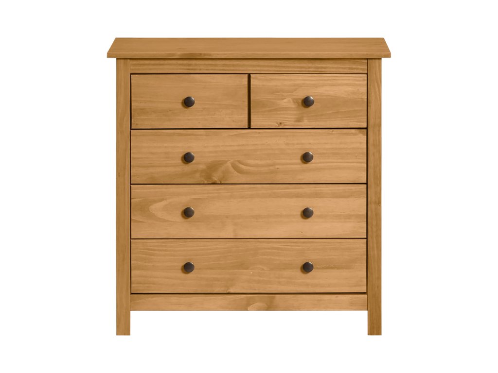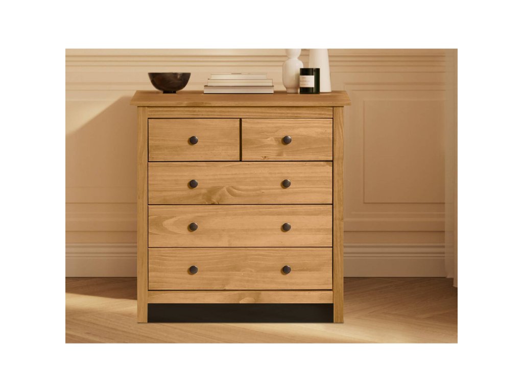 Komoda TORINO je vyrobena z voskovaného masivu borovice v medovém odstínu, který zajišťuje odolnost a přirozený vzhled. Hodí se do obývacího pokoje, ložnice nebo předsíně pro praktické uložení věcí.