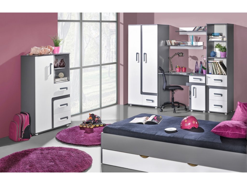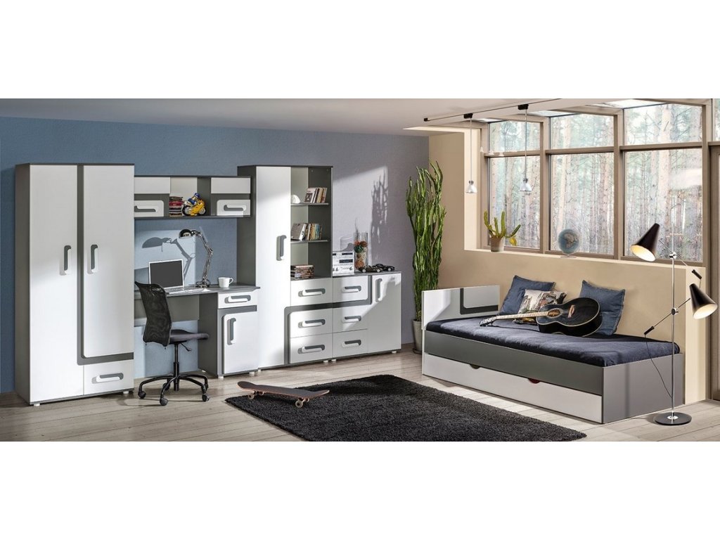Moderní kombinace antracitové a bílé barvy s originálními úchyty dodává interiéru svěží vzhled. Vhodný pro mladé a moderní prostory.