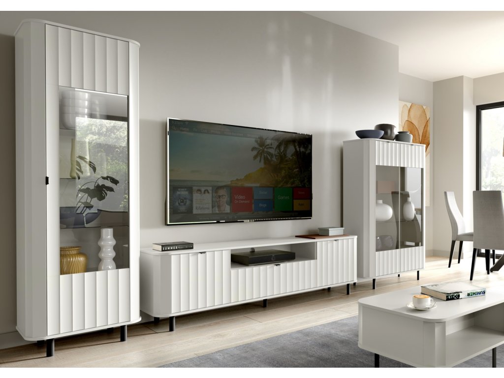 Kolekce nábytku do obývacího pokoje, která spojuje eleganci a funkčnost. Jejím charakteristickým prvkem jsou frézované, fóliované čelní desky z MDF, které dodávají interiéru jedinečný charakter. Díky klasické bílé se hodí do různých stylů zařízení, od moderních po minimalistické.