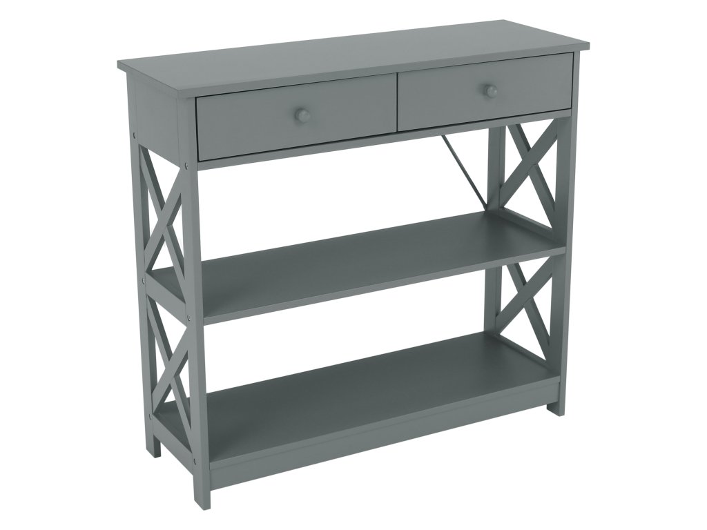 Konzolový stolek LOMIR v šedé barvě nabízí kompaktní úložný prostor díky dvěma zásuvkám a dvěma policím. Vhodný do předsíní, obývacích pokojů nebo kanceláří pro uložení drobností a dekorací.