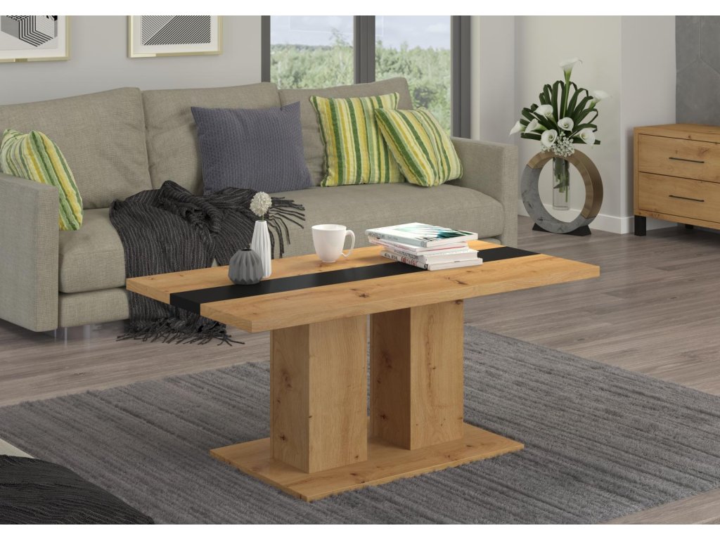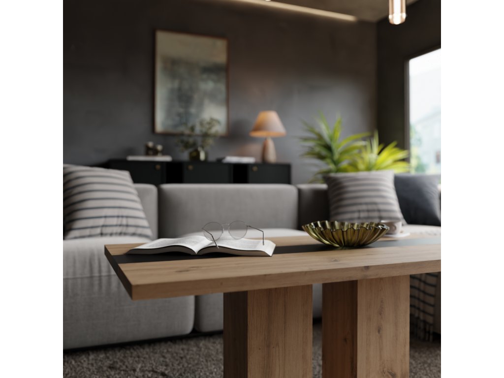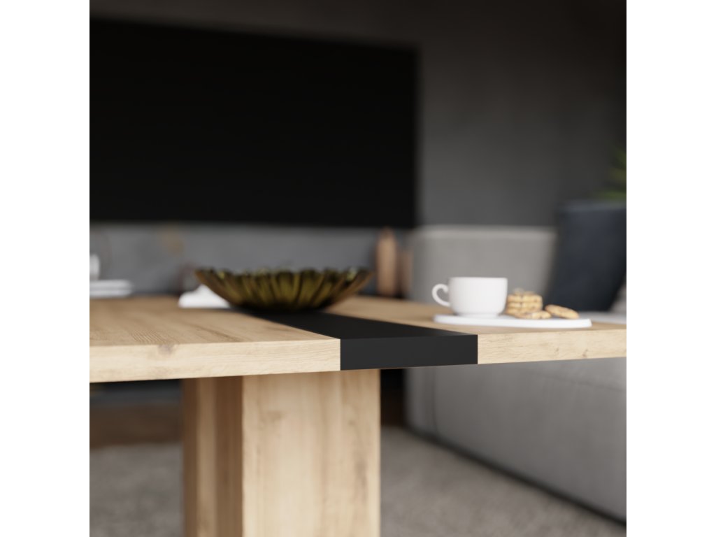 Stolek je vyroben z lamina v dekoru dub artisan s výrazným černým pruhem uprostřed, který podtrhuje jeho současný vzhled a snadno zapadne do různých interiérů.