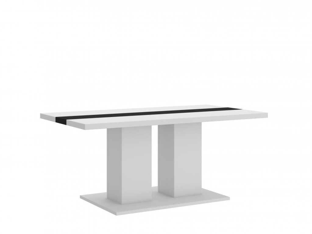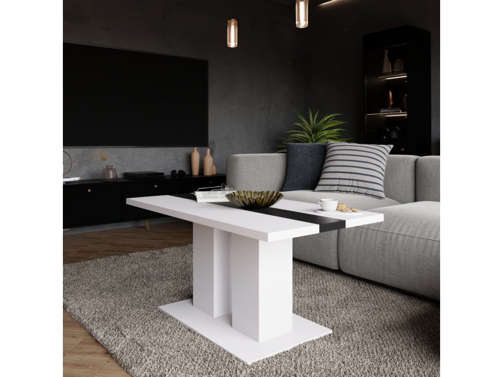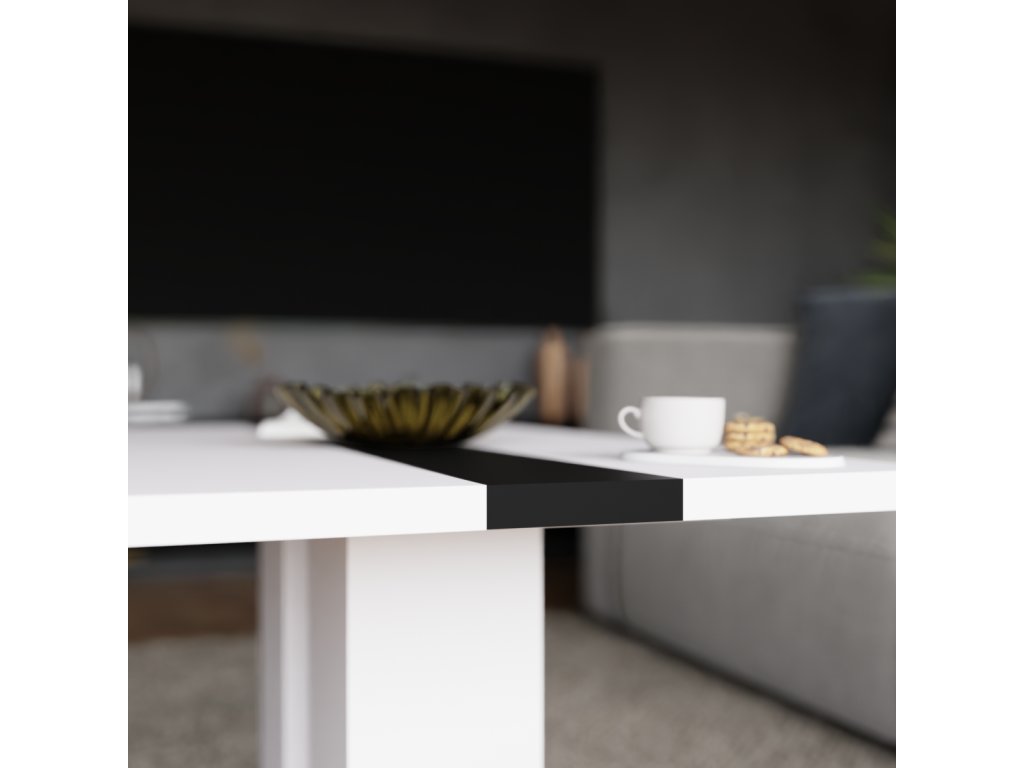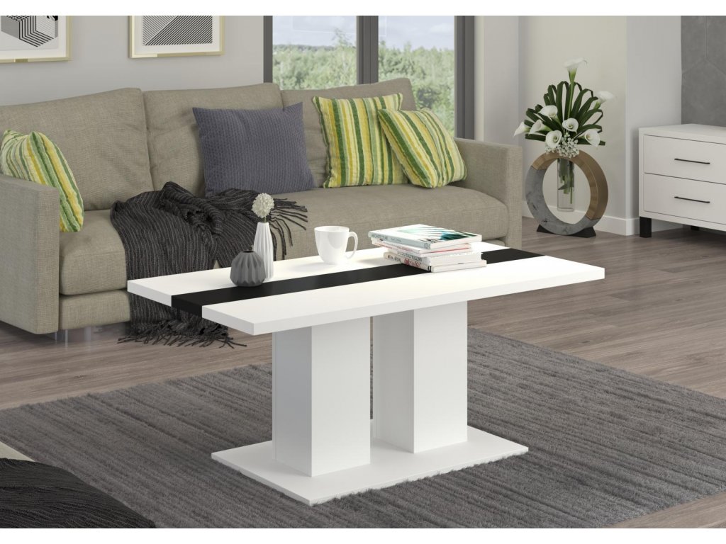Bílý laminát s černým pruhem uprostřed dodává stolku elegantní a současný vzhled, který snadno zapadne do různých interiérů.