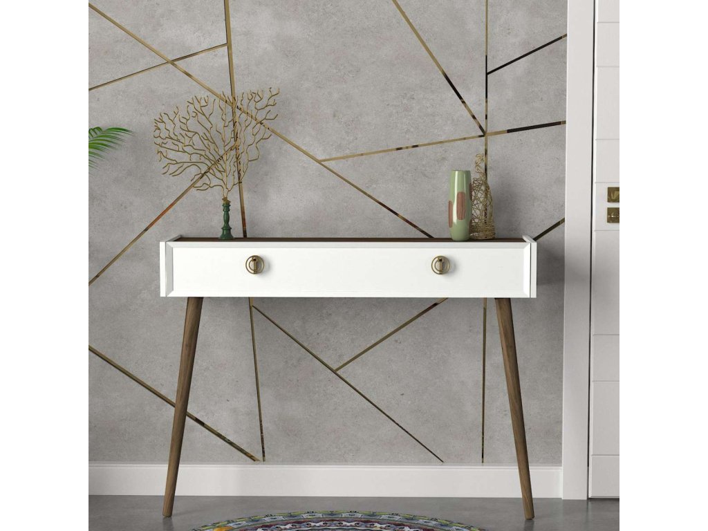 Konzolový stolek BELMONTE v bílé a ořechové kombinaci je ideální do obývacího pokoje nebo předsíně. Nabízí dostatek prostoru pro dekorace, knihy nebo drobnosti díky své zásuvce a obdélníkovému tvaru.