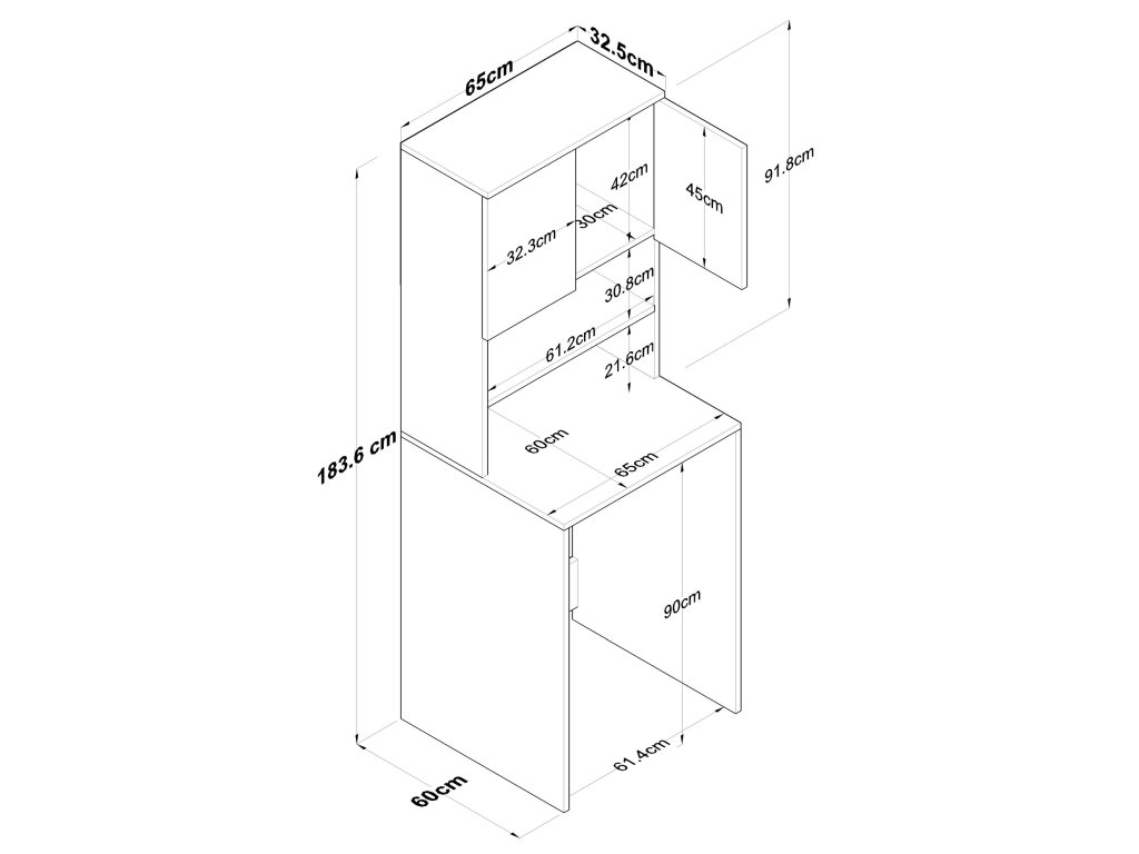 Vysoká konstrukce s rozměry 183,6 x 65 x 60 cm nabízí dostatek úložného prostoru díky dvěma dvířkům a odkládací polici. Ideální nad pračku nebo do koupelny.