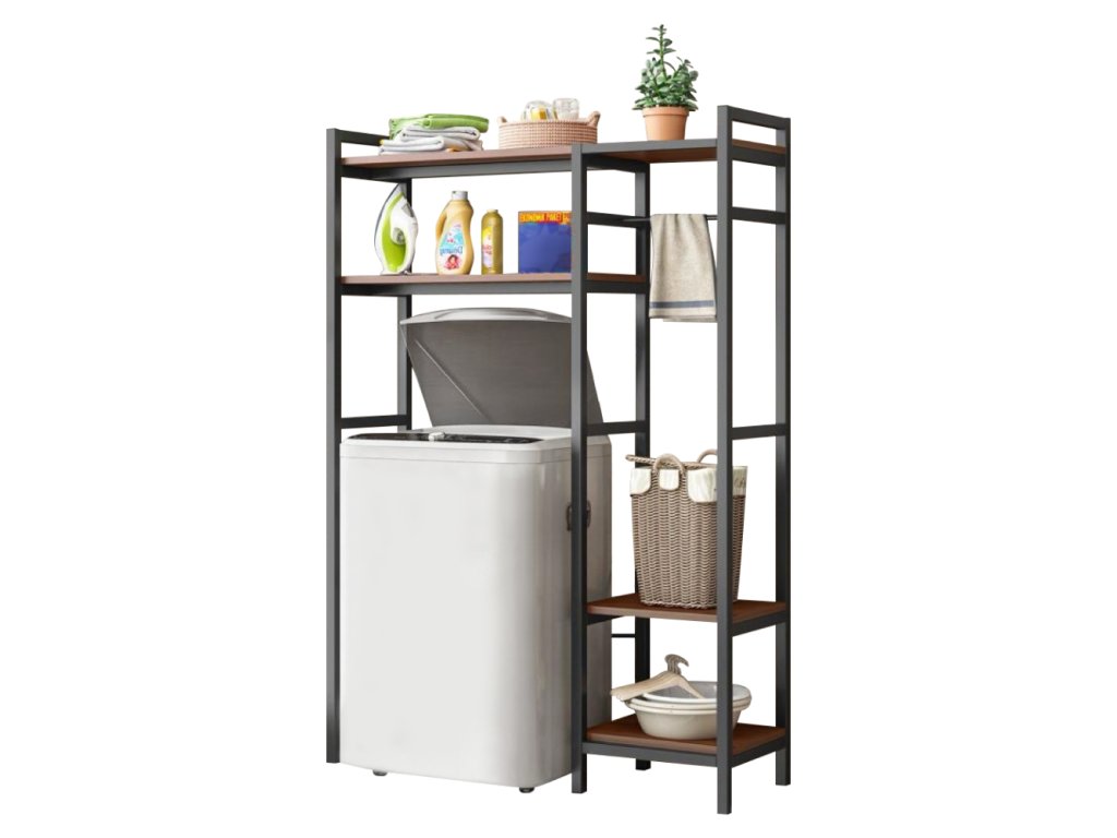 Rozměry umožňují umístění pračky do prostoru 65x126 cm. Otevřené police a kovová tyč poskytují místo na odkládání a zavěšení textilií.