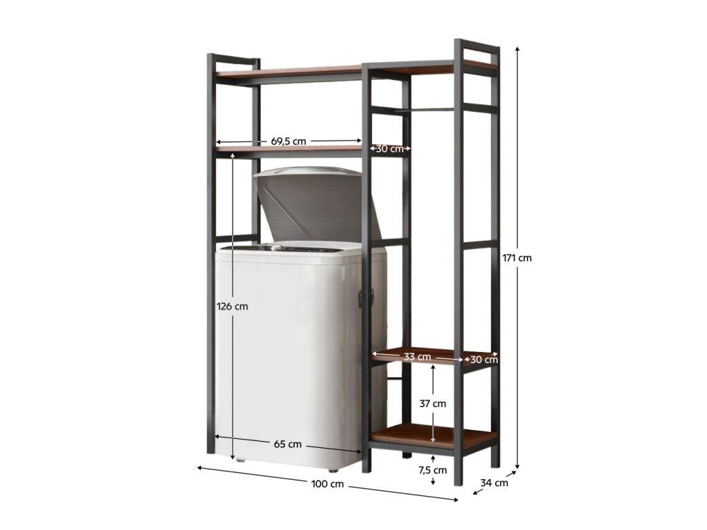 Regál má šířku 100 cm, hloubku 34 cm a výšku 171 cm, což umožňuje efektivní využití prostoru nad pračkou.