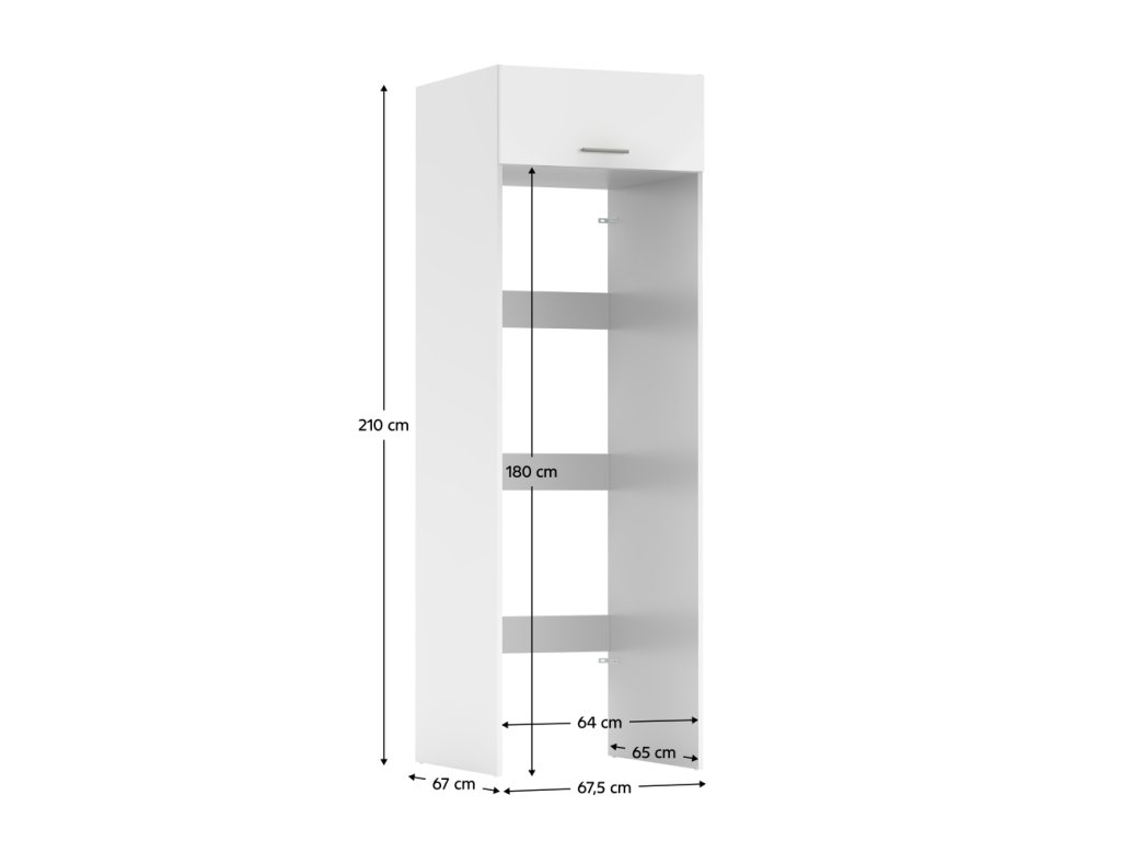 Rozměry umožňují umístit pračku a sušičku do prostoru 64x65x180 cm. Výška 210 cm poskytuje dostatek úložného místa.