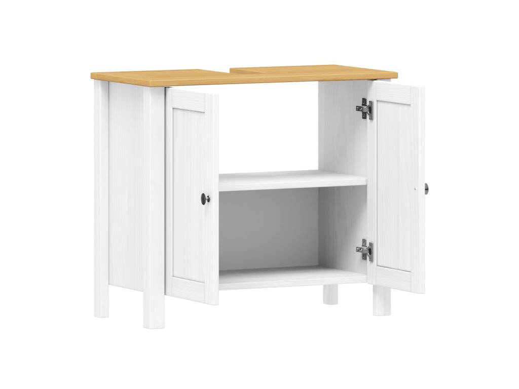 Vyrobena z masivního borovicového dřeva, skříňka je pevná a odolná vůči vlhkosti, což je klíčové pro koupelnové prostředí.