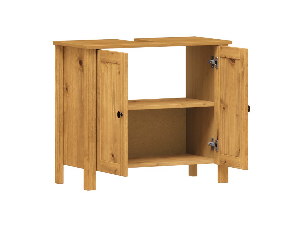 Vyrobena z masivní borovice s voskovaným povrchem, který je odolný vůči vlhkosti. Dvířka a police jsou navrženy pro jednoduché otevírání a čištění.