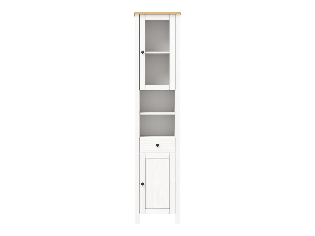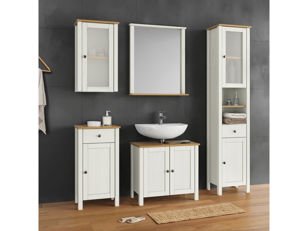 Vyrobena z masivu borovice s povrchovou úpravou v bílé a bukové barvě. Dvířka jsou kombinací prosklených a plných, s kovovými pojezdy zásuvky. Skříňka je pevná a odolná, vhodná pro vlhké prostředí koupelny.