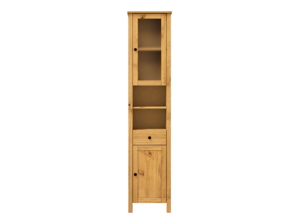 Vyrobena z masivní borovice s voskovaným povrchem, který chrání dřevo a zvýrazňuje jeho přirozenou strukturu. Dvířka jsou prosklená a plná, s kovovými pojezdy u zásuvky.