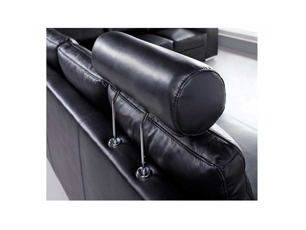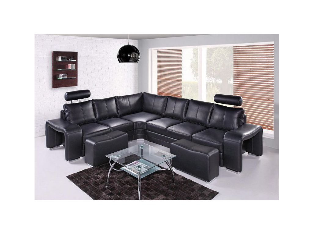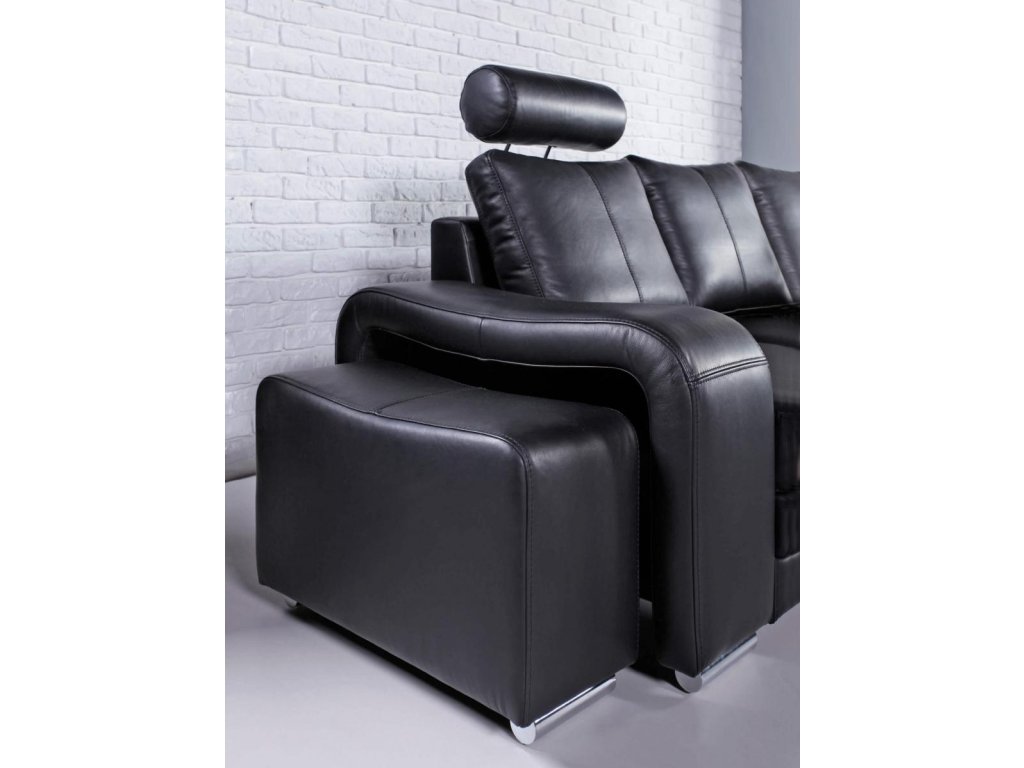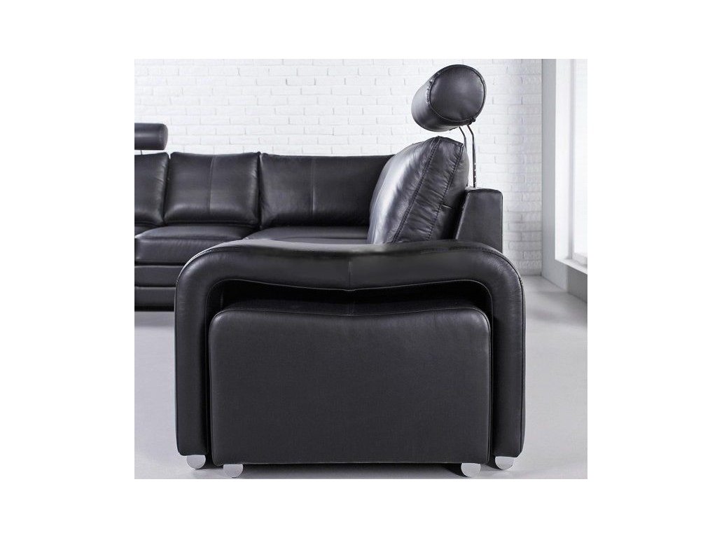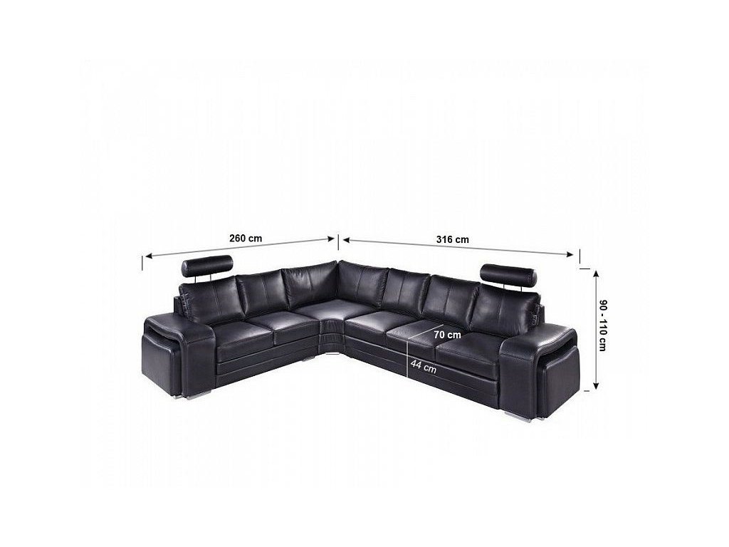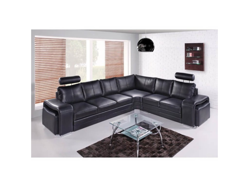 Černá kůže dodává elegantní vzhled a je snadná na údržbu s vhodnými přípravky. Sedací souprava je dostupná v pravém i levém provedení, přizpůsobitelná prostoru vašeho obýváku.