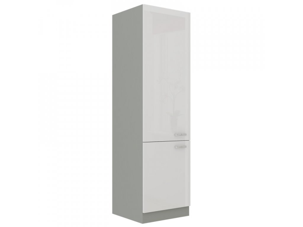 Tato vysoká kuchyňská skříň určená pro vestavěnou lednici a mrazák je vyrobena z lamina tloušťky 16 mm bílé lesklé barvy a skvěle vám doplní kuchyňskou sérii. Korpus skříňky je v šedém provedení. Na dvířkách jsou kovové úchytky ( délka 135mm). Dveře jsou vybaveny systémem tichého zavírání. Lednice nesmí být vyšší než 177cm. Dolní část skříně je určena pro mrazák, který nesmí být vyšší než 71cm.