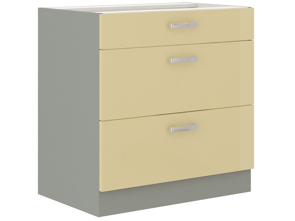 Tato spodní kuchyňská skříňka je vyrobena z lamina tloušťky 16 mm v lesklé krémové barvě. Korpus skříňky je v šedém provedení. Skříňka je tvořena jedním nižším a dvěmi vyššími šuplíky (vnitřní barva je bílá) které Vám poskytnou dostatek místa k uložení všeho co budete potřebovat. Dvířka mají lesklé kovové úchytky a lze je namontovat horizontálně nebo vertikálně (délka 135 mm). Dále jsou dvířka vybavena systémem tichého zavírání. Skříňka je vyrobena z kvalitních MDF desek. V doplňkových fotografiích naleznete další možnosti a inspiraci k sestavení Vaší vysněné kuchyně. Poskládejte si z naší bohaté nabídky skříněk moderní a designovou kuchyň podle Vašich představ. Skříňka je dodávaná v demontu. Součástí je montážní plánek včetně všech potřebných spojovacích materiálů.