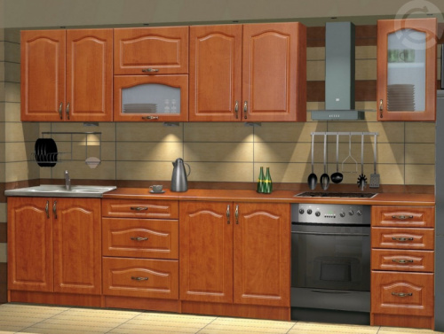 Moderní kuchyně patřící k nejlevnějším na trhu se prodává jako sestava v typizovaném rozměru, ale je možné si ji poskládat i po skříňkách na míru své kuchyně. Níže naleznete jak typizovanou kuchyni, kde si můžete jen dokoupit další skříňky, tak i skříňky, ze kterých si jednoduchým zakliknutím vytvoříte vlastní sestavu. Pokud budete mít zájem o více kusů jedné skříňky nebo desky, je třeba ji doobjednat zvlášť až po vložení celé sestavy do košíku. ( Tlačítkem ZPĚT ve vašem prohlížeči se vrátíte do nabídky a po zakliknutí obrázku té dané položky si ji v potřebném množství doplníte do košíku ). Kuchyně má horní skříňky výšku 72 cm, hloubku 30 cm a dolní skříňky výšku 82 cm, hloubku 44 cm, dvířka jsou z kvalitní MDF v barvě hruška, korpusy i sokl z lamina jsou ve stejné barvě. Spodní skříňky neobsahují pracovní desku v ceně, tu je třeba doobjednat. Úchyty jsou plastové. Sklo ve vitríně je na výběr - čiré nebo mražené. Dodáváme v demontovaném stavu.