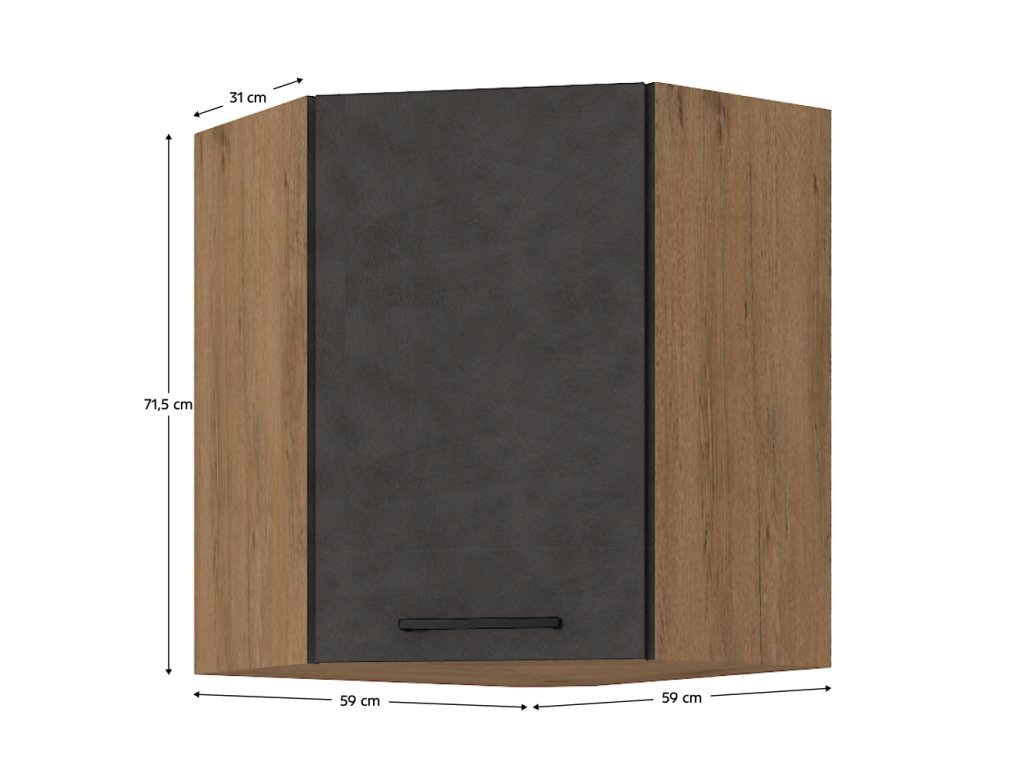 Horní skříňka VEGA v kombinaci dub lancelot a šedá matná nabízí dostatek prostoru pro uskladnění kuchyňského náčiní a potravin. Vhodná pro zavěšení nad pracovní plochu, šetří místo a udržuje pořádek.