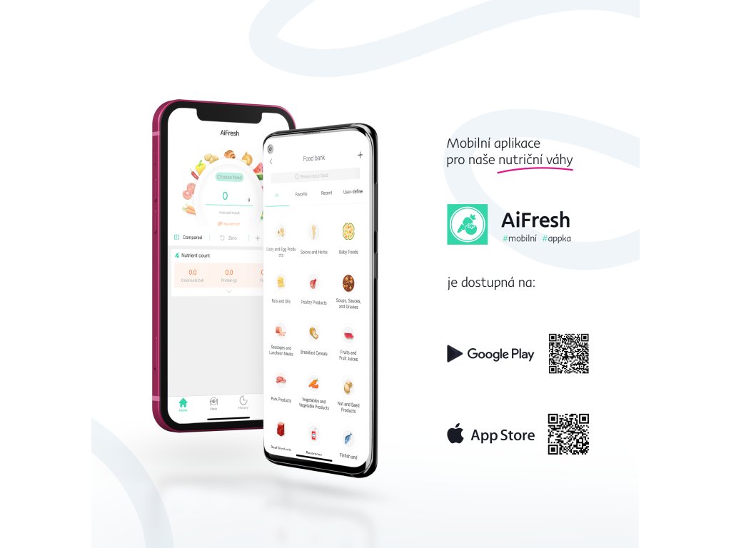Váha rozpoznává potraviny podle číselného kódu a zaznamenává nutriční hodnoty přes aplikaci. Umožňuje sledovat historii vážení a plánovat jídelníček.