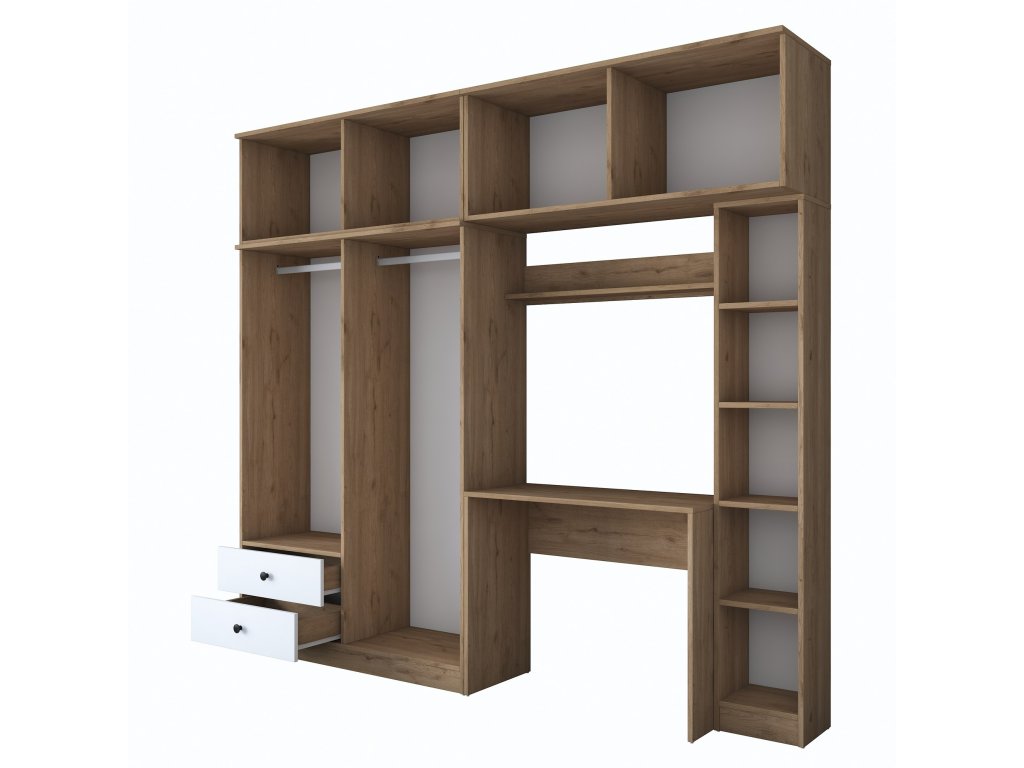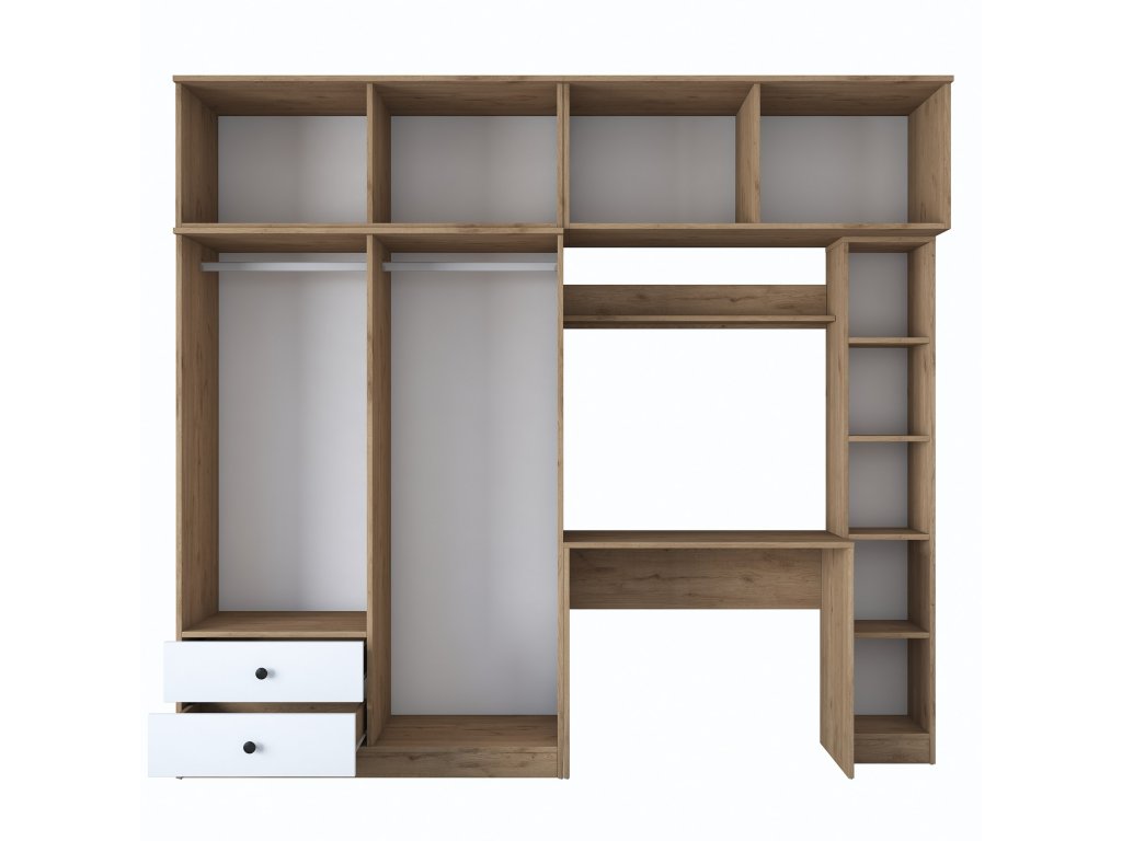 Vysoká a široká sestava s rozměry 216,8 x 240 cm, tloušťka materiálu 18 mm, stabilní a pevná konstrukce. Součástí jsou 2 zásuvky pro drobnosti.