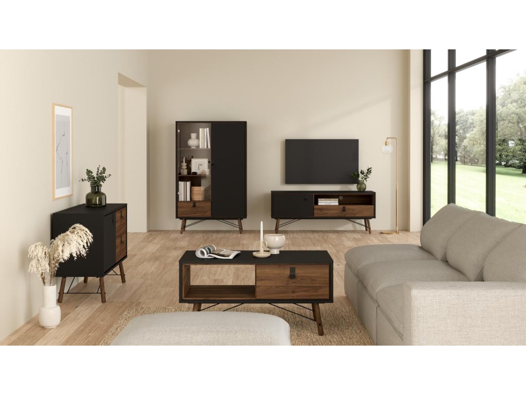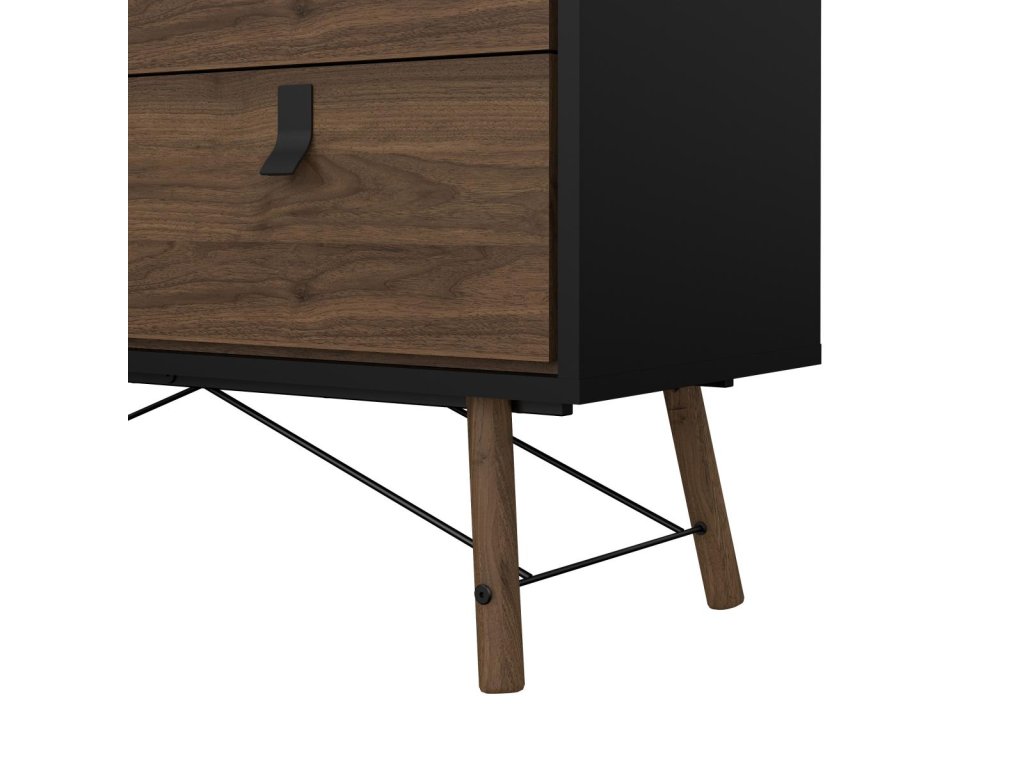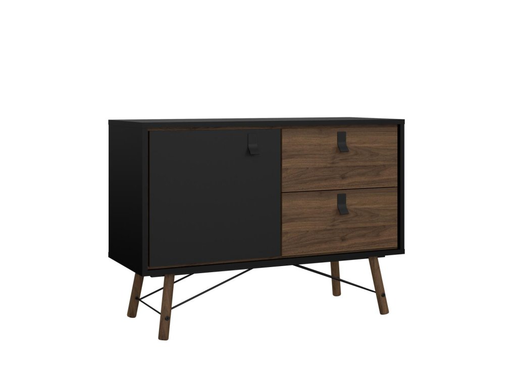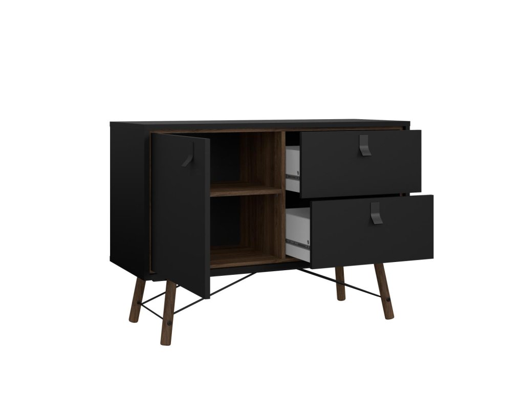 Elegantní černý matný povrch v kombinaci s ořechovým dekorem a šikmými nohami z masivního buku vytváří nadčasový vzhled s iluzí plovoucích čel.