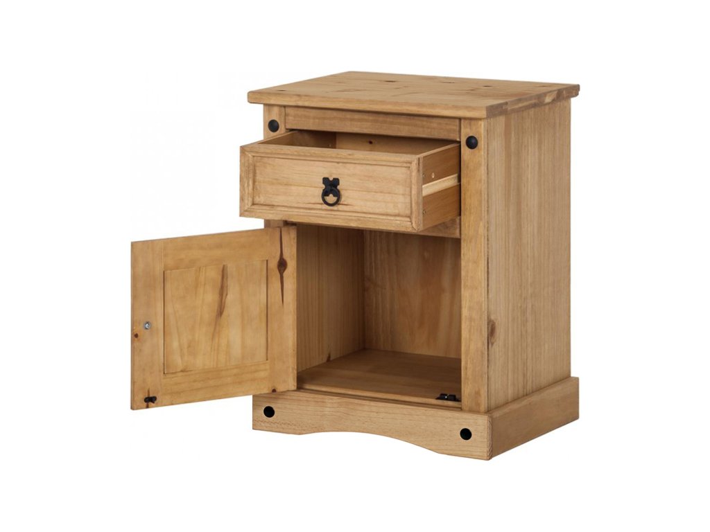 Noční stolek CORONA vosk 16345 je vyroben z masivní borovice s medovým voskovým odstínem. Nabízí dostatek úložného prostoru díky zásuvce a dvířkům, ideální pro uložení drobností u postele.