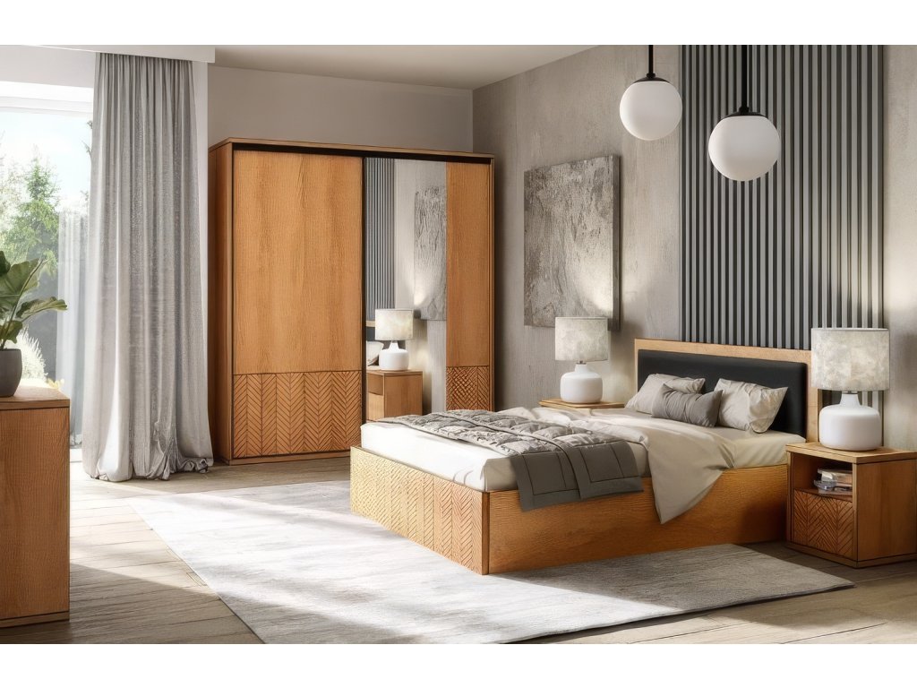 Ložnicová sestava : postel s roštem160 x 200 cm, šatní skříň s posuvnými dveřmi a zrcadlem a 2x noční stolek se zásuvkou a úložným prostorem.