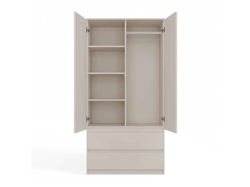 Šatní skříň Malvína v trendy barvách a moderním designu je praktický kus nábytku, který najde své uplatnění v ložnici, dětském pokoji, ale také v kanceláři nebo domácí pracovně. Nabízí dostatek úložného prostoru s možností instalace polic nebo šatní tyče v závislosti na vašich požadavcích. Dvířka se systémem TIP-ON se otevírají po jemném zatlačení čela dvířek. Nábytek je vyroben z nejkvalitnější laminované desky odolné proti poškrábání a vlhkosti, hrany jsou zakončené ABS materiálem.