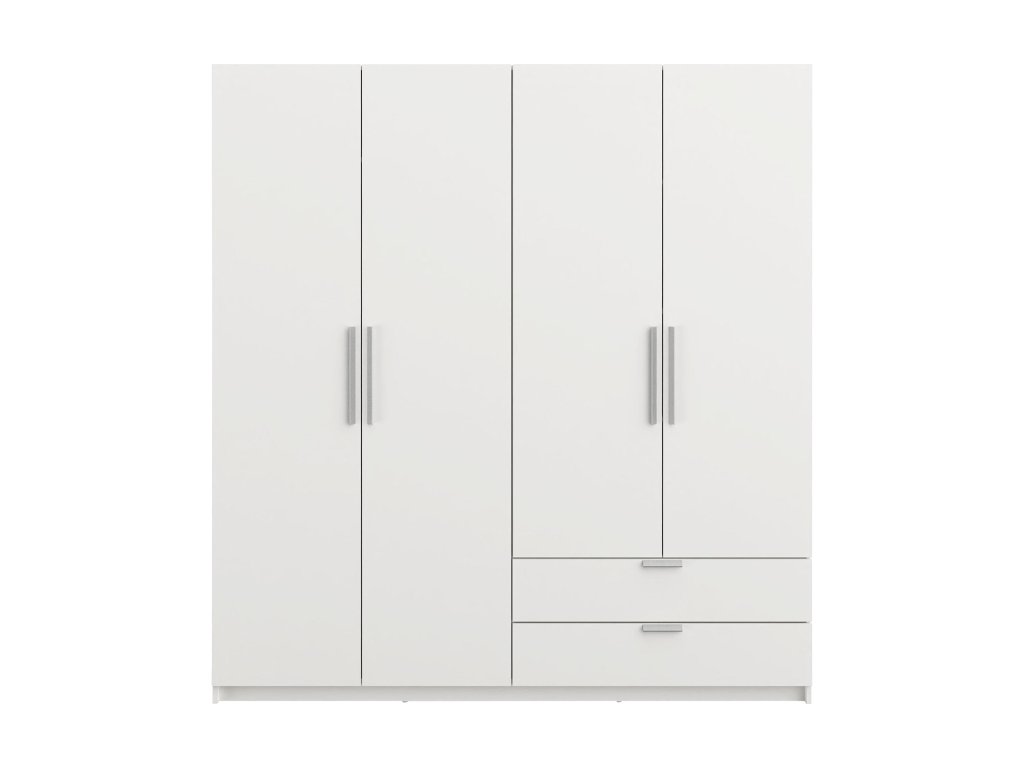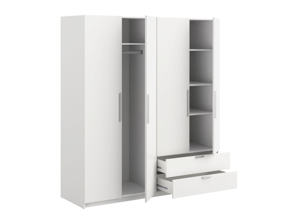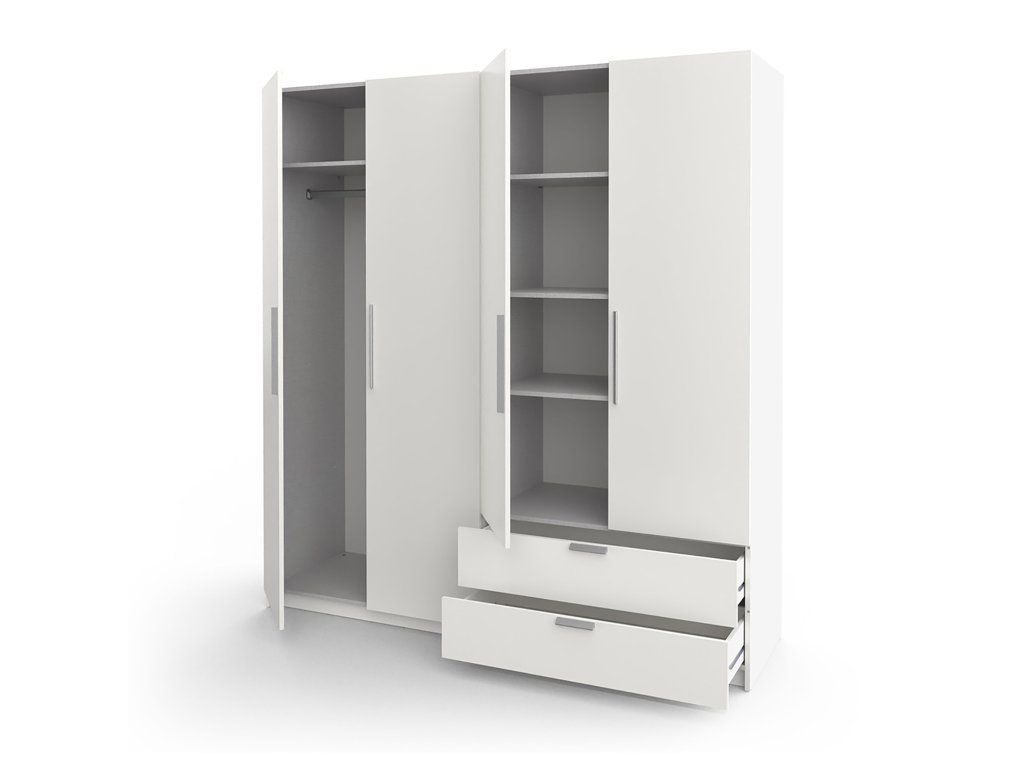 Čtyřdveřová skříň GLORY 2 v bílé barvě nabízí rozdělení na dvě části – levá s šatní tyčí a policí na klobouky, pravá s policemi a zásuvkami. Umožňuje efektivní organizaci oblečení i doplňků.